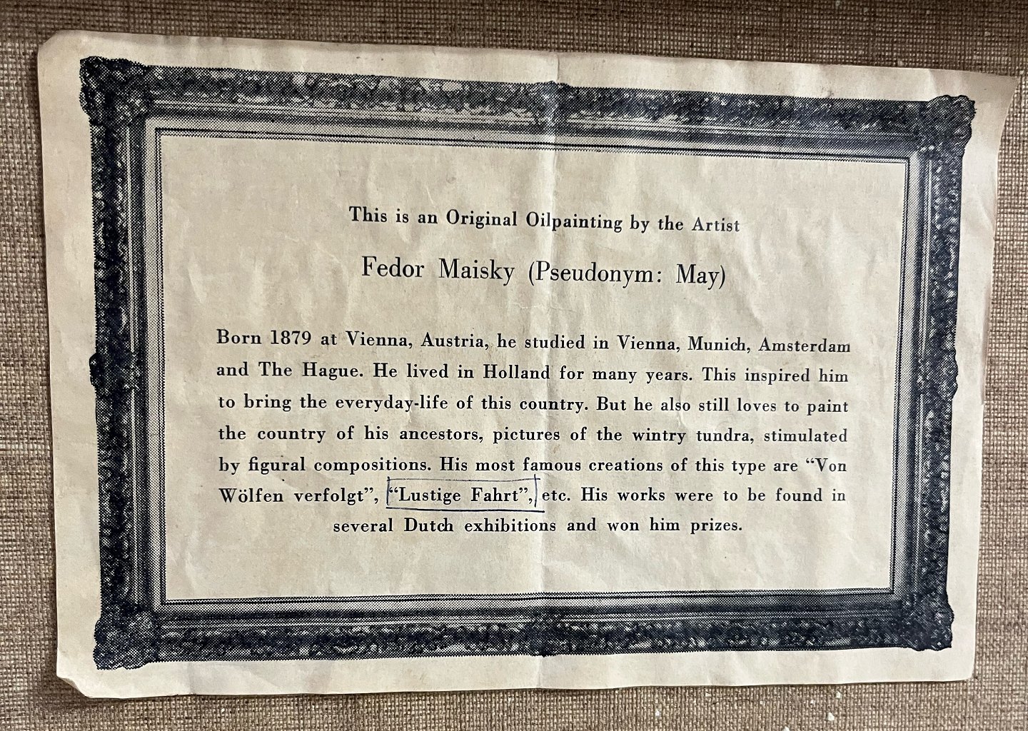 Fedor Maisky (born 1879) was an Austrian painter known for his figurative and often narrative compositions, where landscapes and human activity are integrated into a harmonious whole. His works are characterized by a light, atmospheric brushwork with an emphasis on light, movement, and mood, combining naturalistic observation with an impressionistic approach to colour.