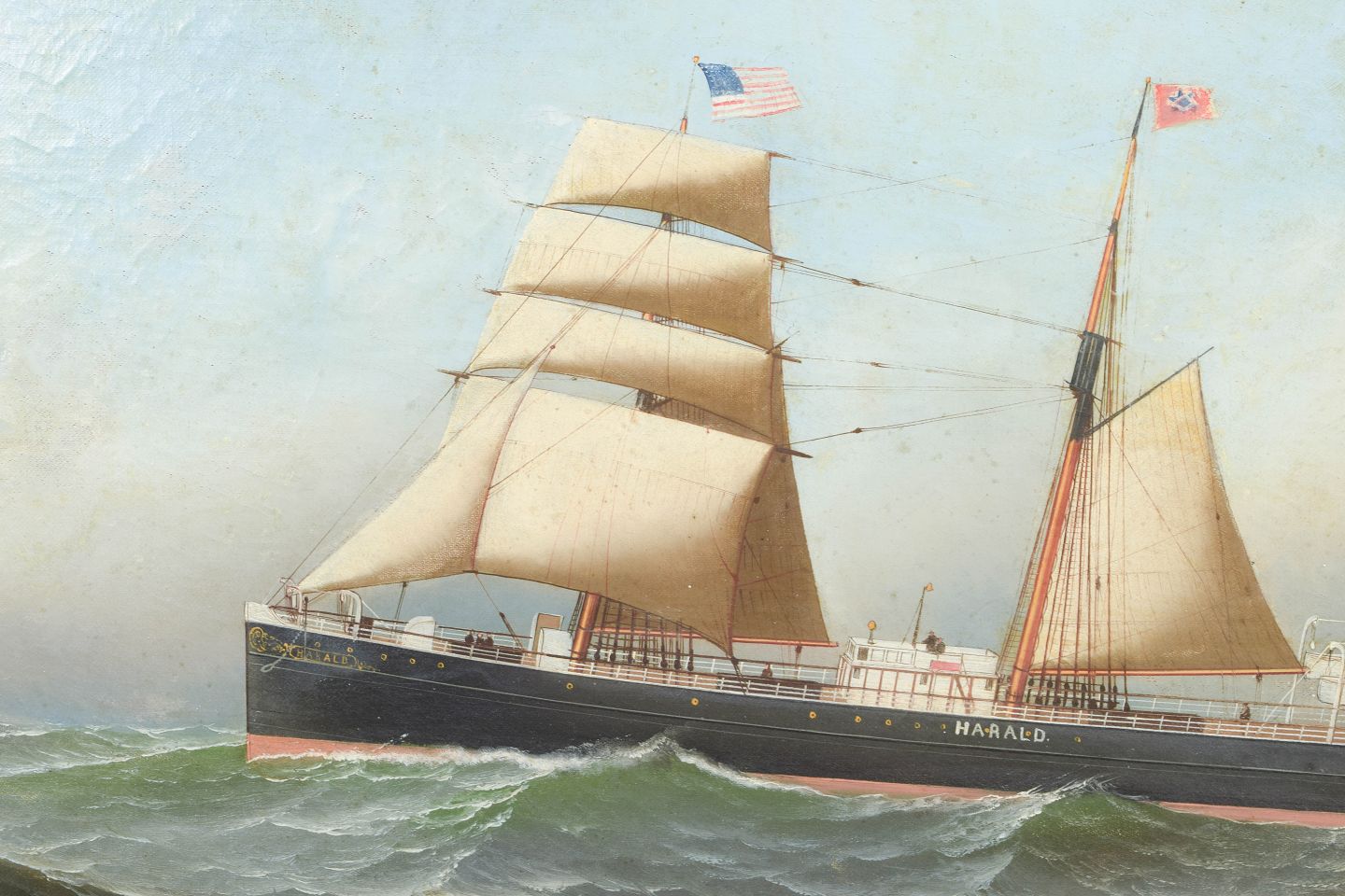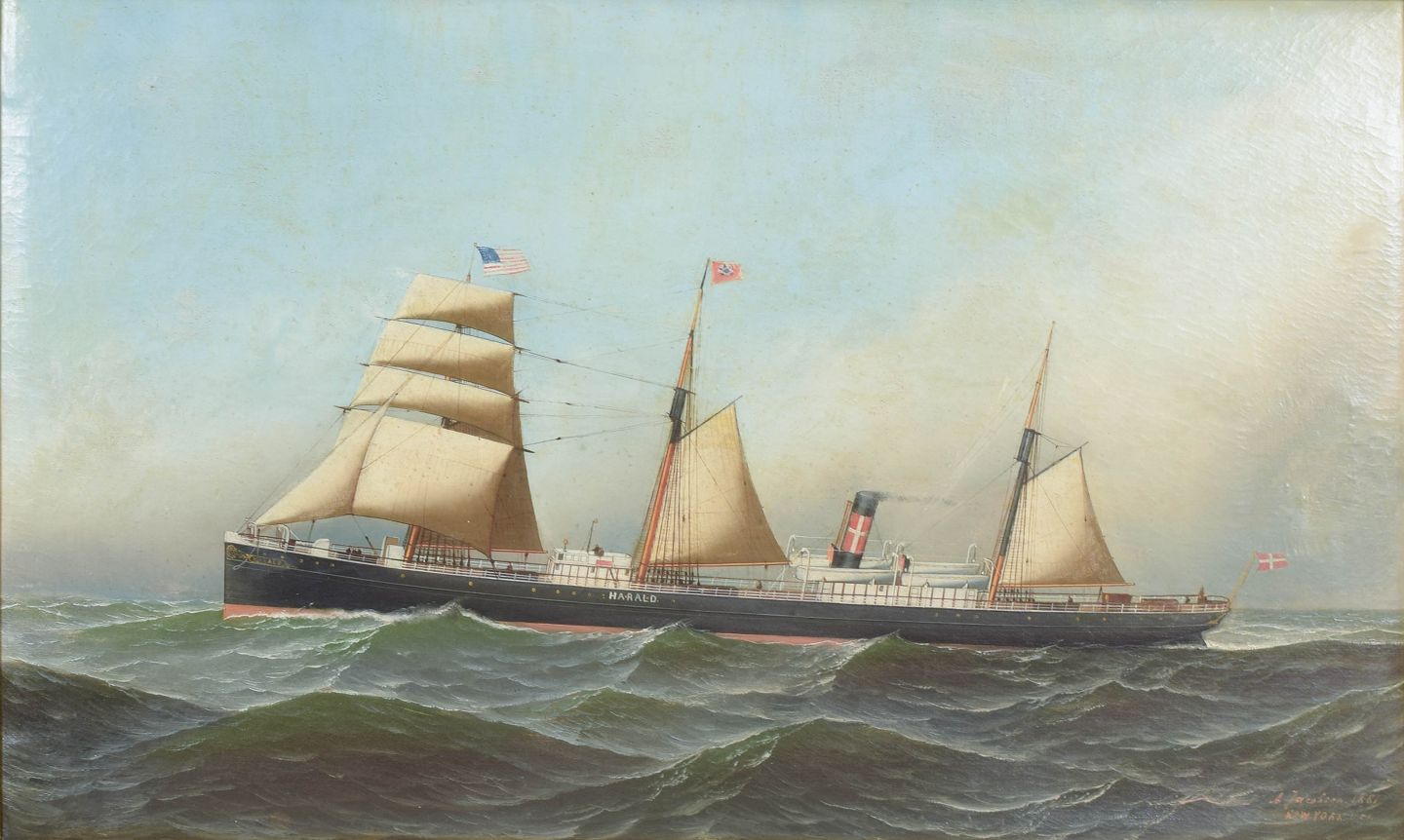 Antonio Jacobsen, marine painting, listed Danish-American artist.Detailed depiction of a steamship under sail on open water with rolling waves and a clear sky. The composition is executed with high precision in the rendering of the vessel’s structure and rigging, characteristic of the artist’s maritime works. Oil on canvas, signed and dated 1881.