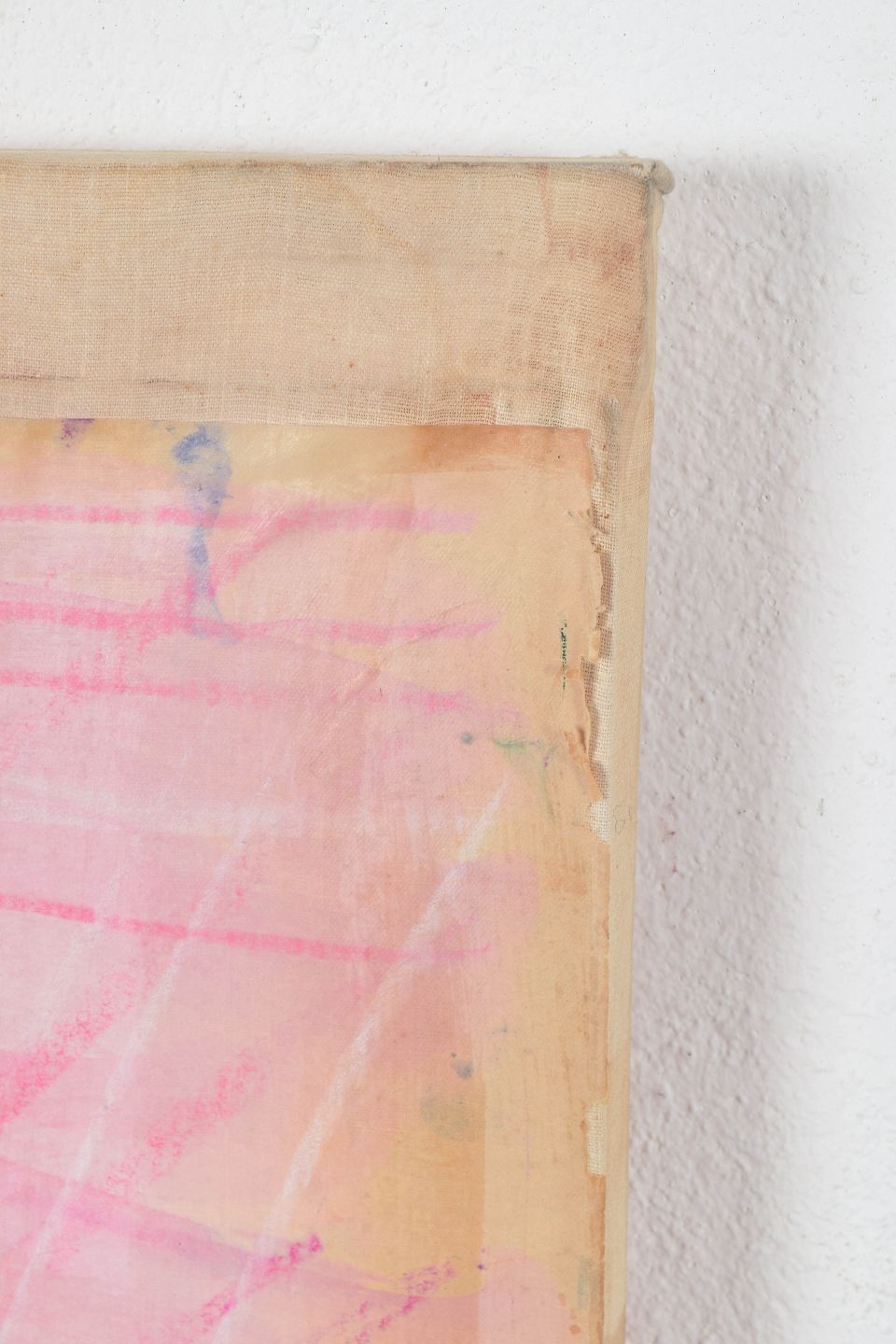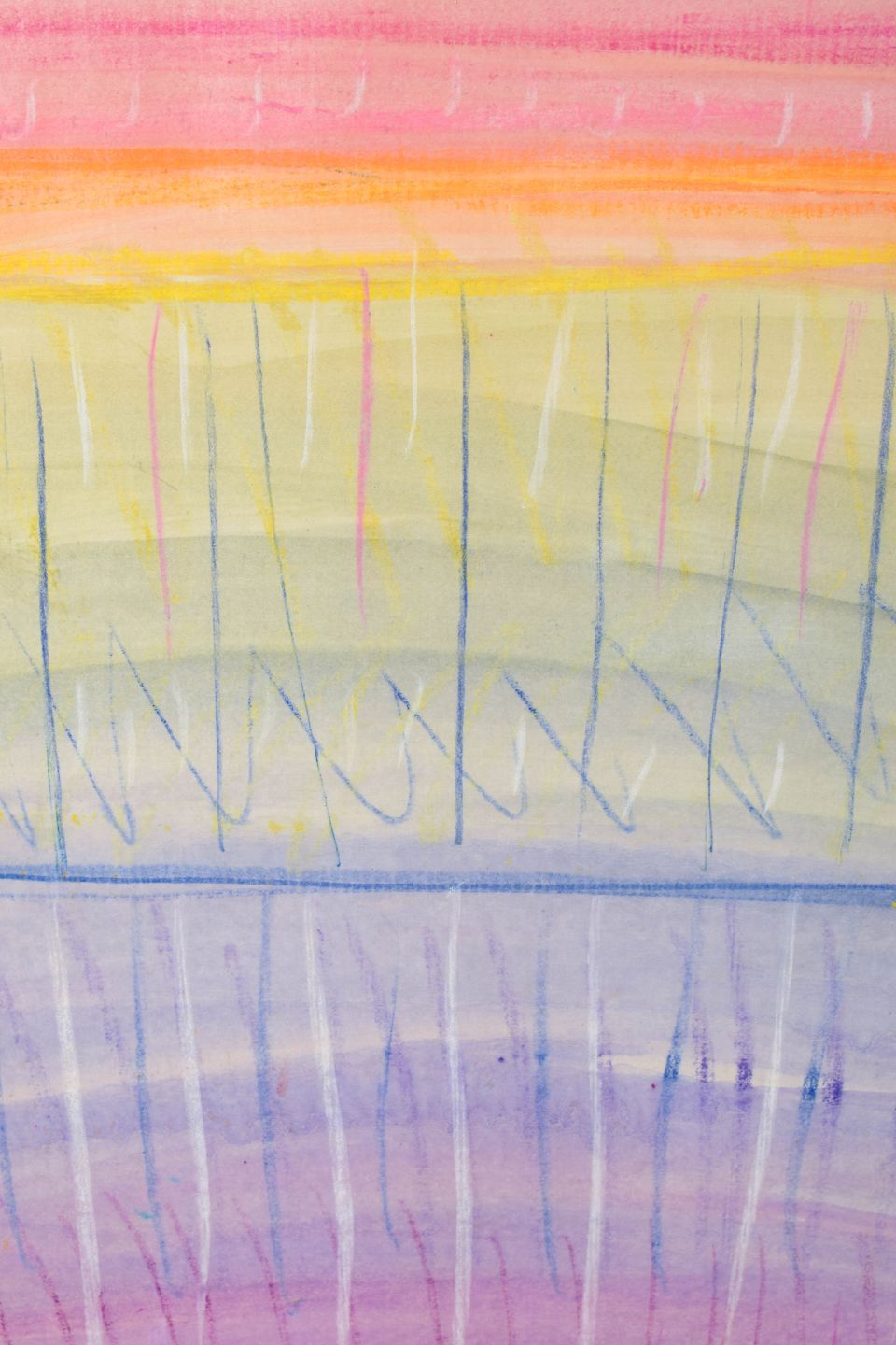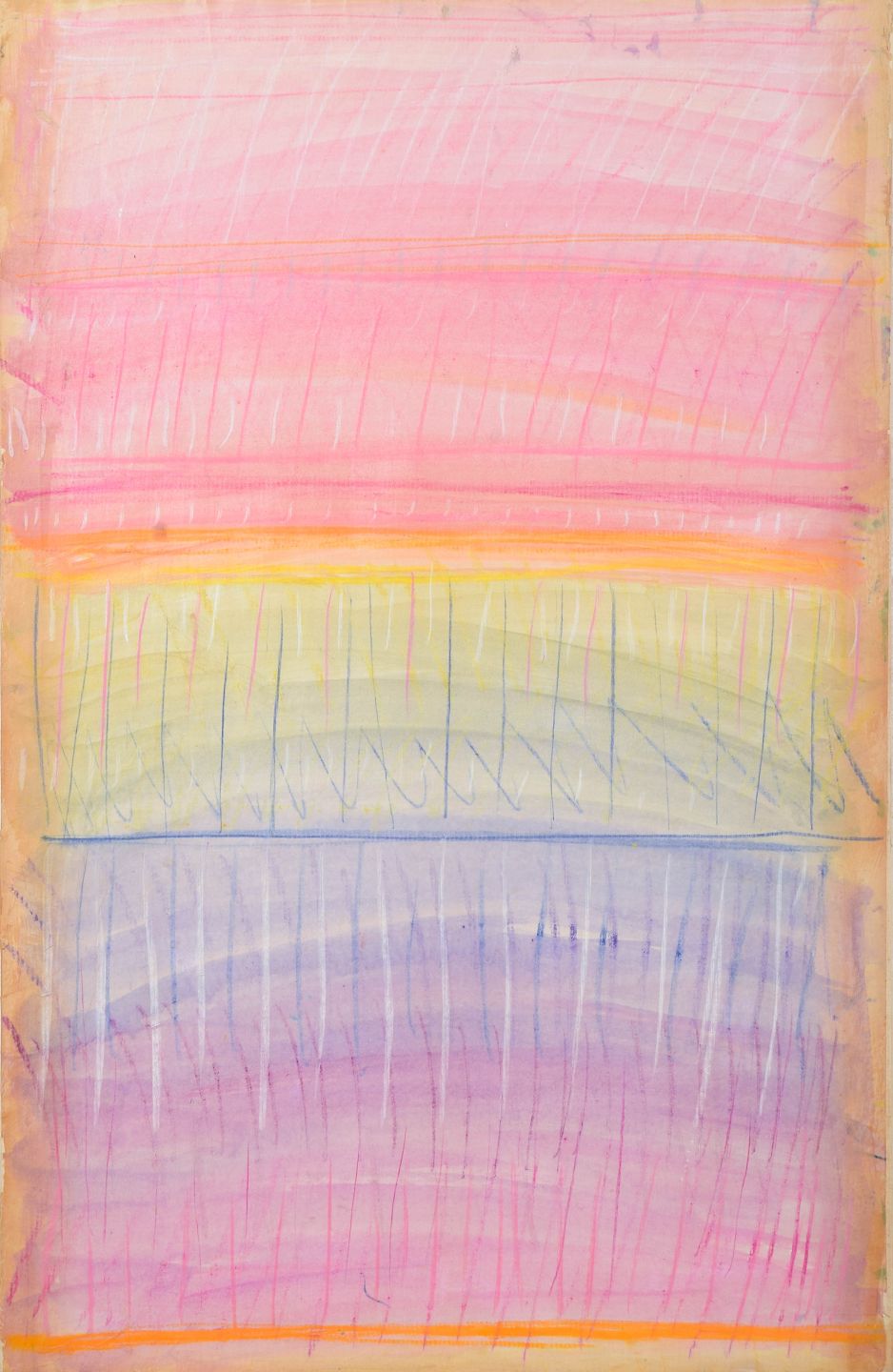 Monique Beucher (1934) French artist, mixed media.Abstract composition executed on paper mounted on canvas, with horizontal color fields in pink, yellow, and blue tones, combined with gestural line work.