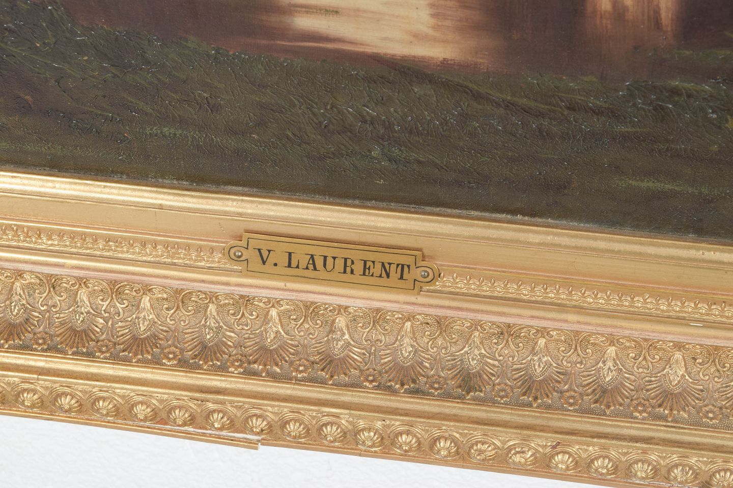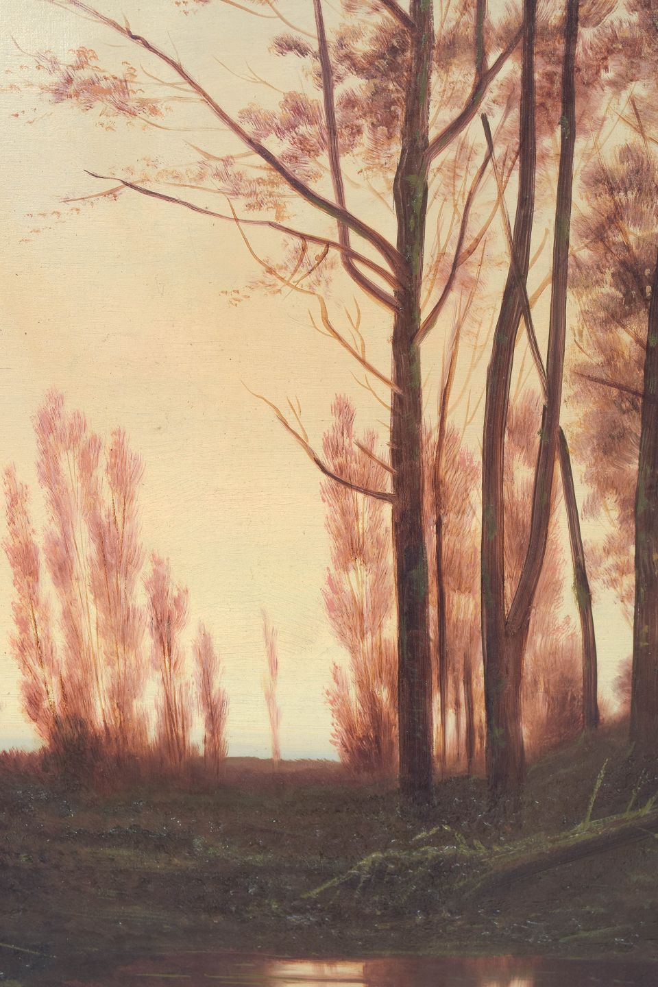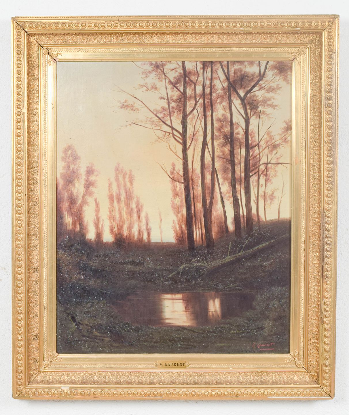V. Laurent, oil on canvas, listed French artist.Atmospheric landscape depicting slender trees by a stream in warm evening light, executed in a naturalistic manner with soft transitions and a subdued colour palette. Signed lower.