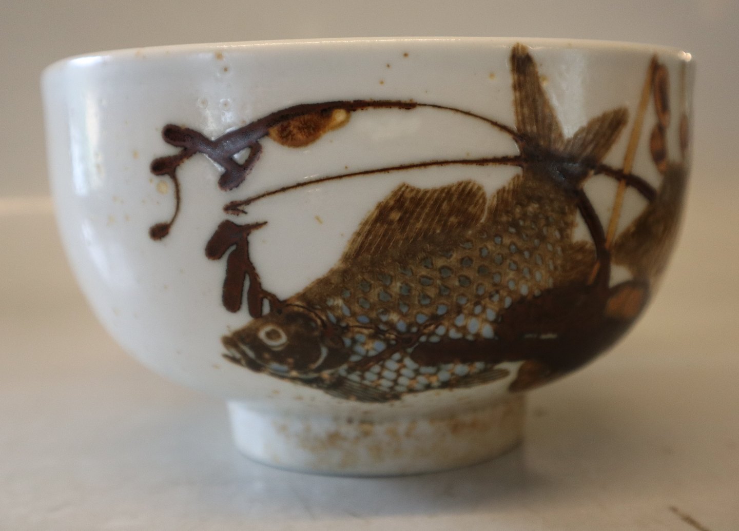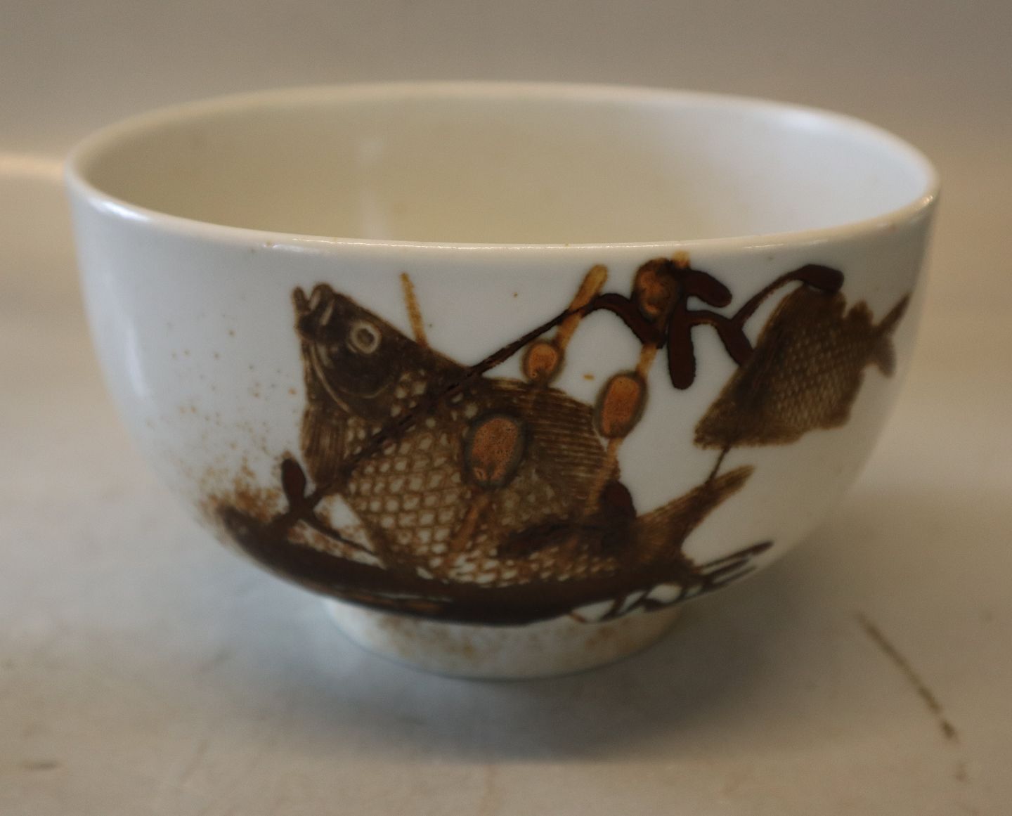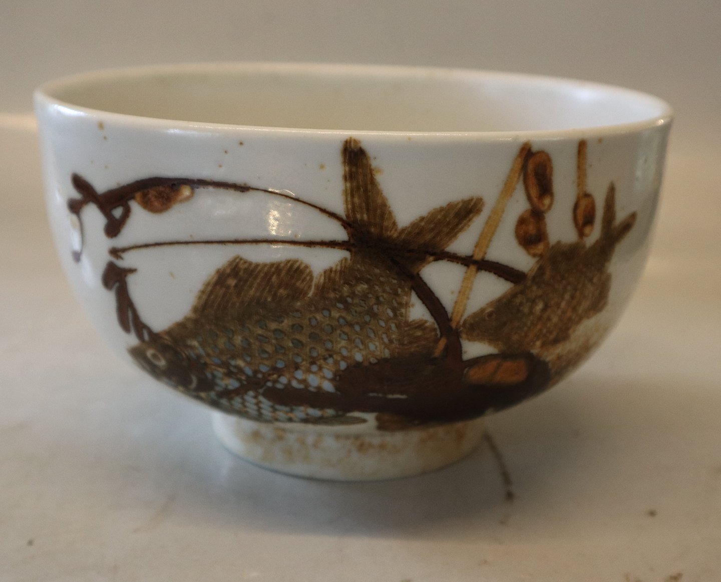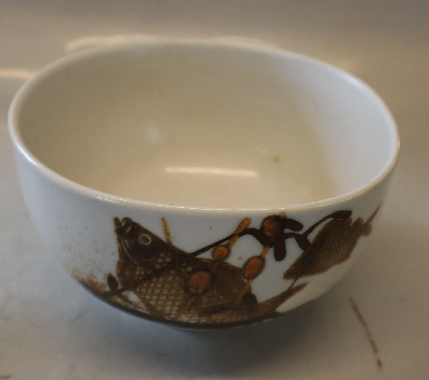 1 pcs. In stock1053-5318 RC Alumnia Diana Stoneware bowl with fish 10 x 17 cm Nils Thorsson Royal Copenhagen Aluminia Faience