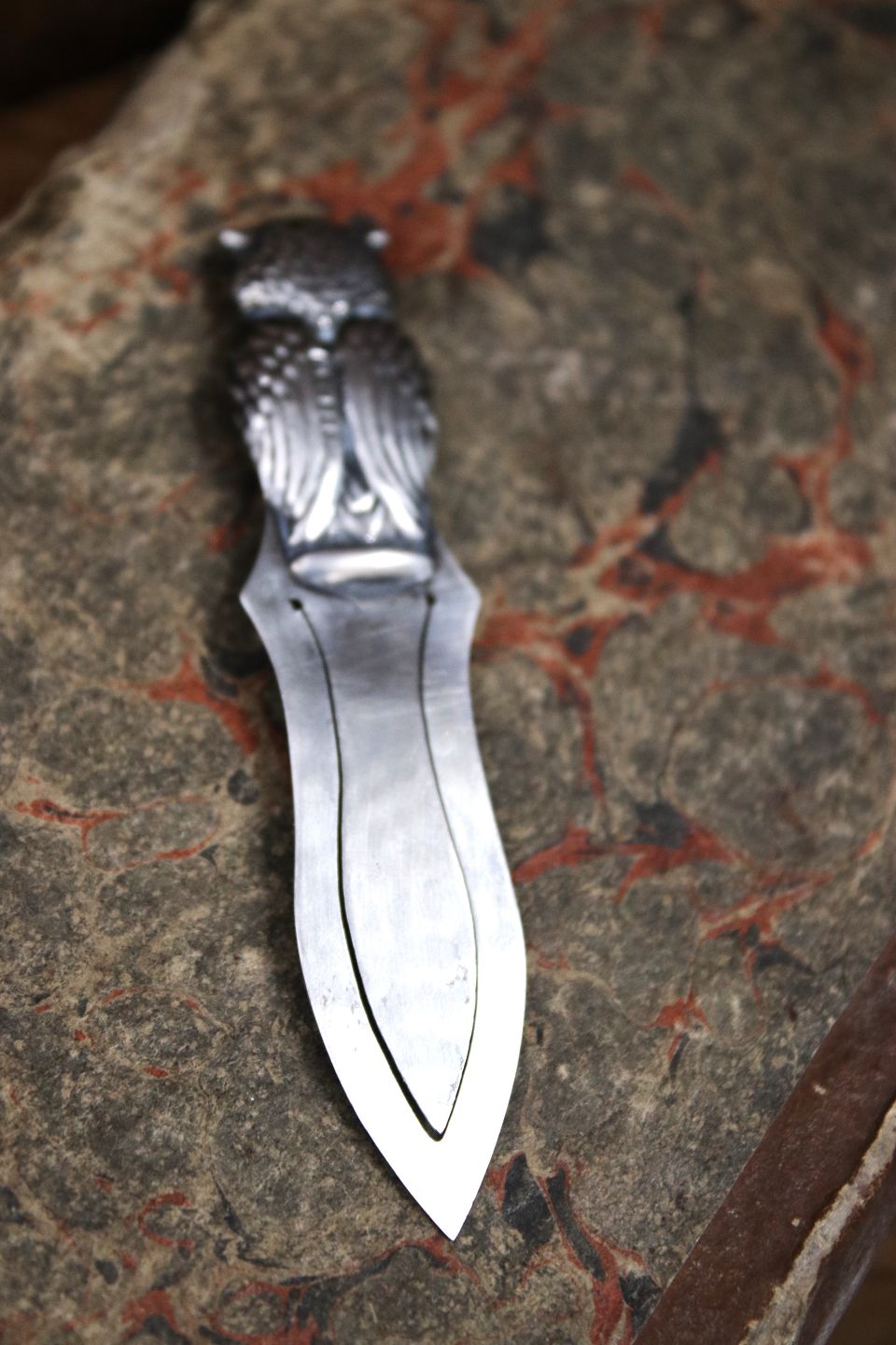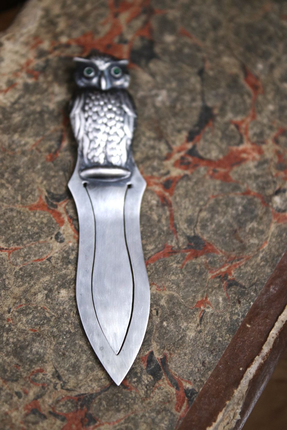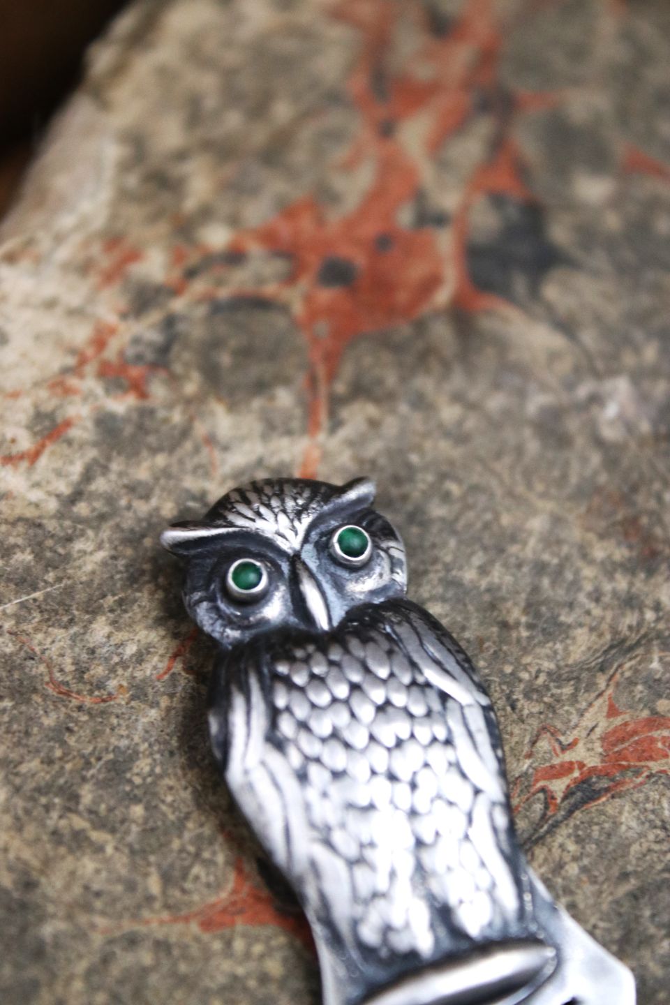Old silver bookmark in the shape of a small owl with green glass eyes. Stamped 830s. Length: 8.6cm.Item number: Bogmærke sølv nr.2