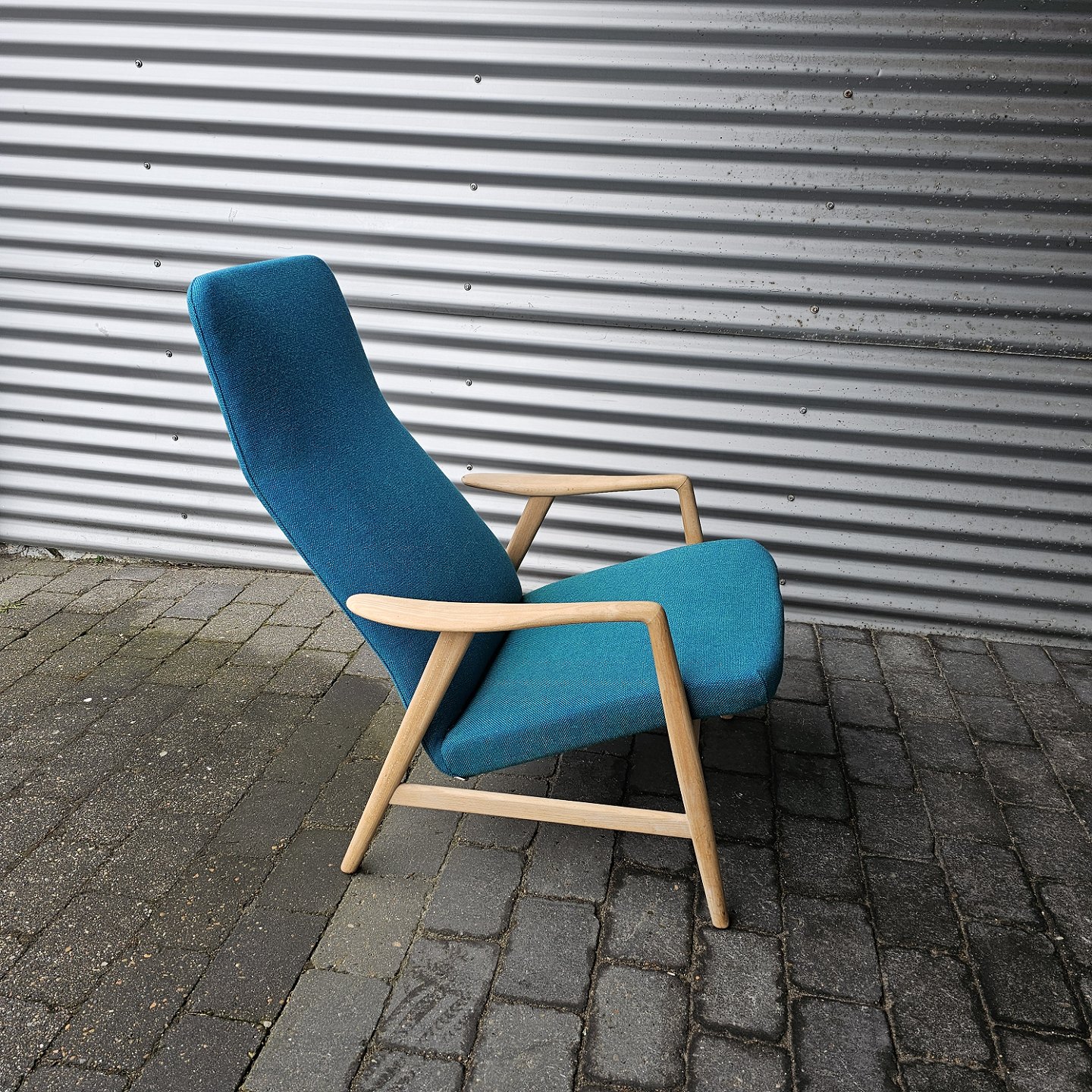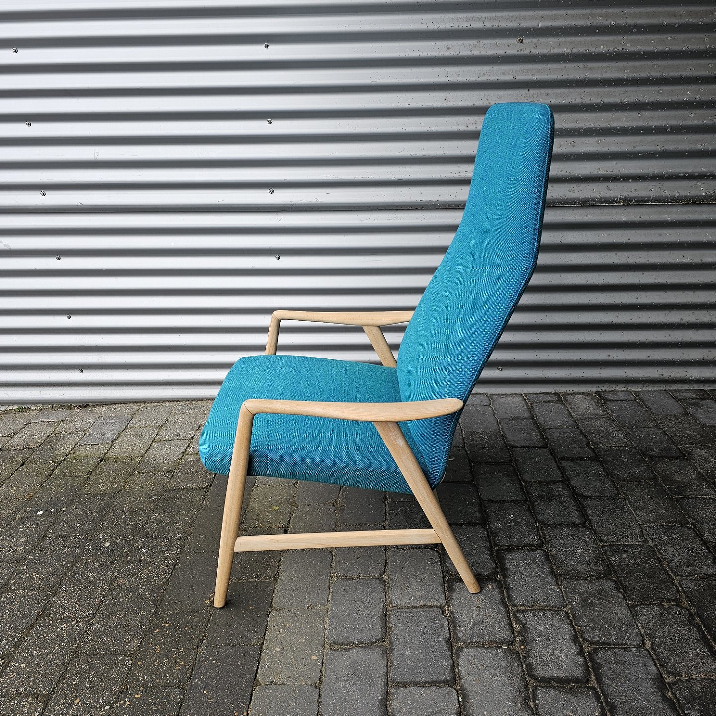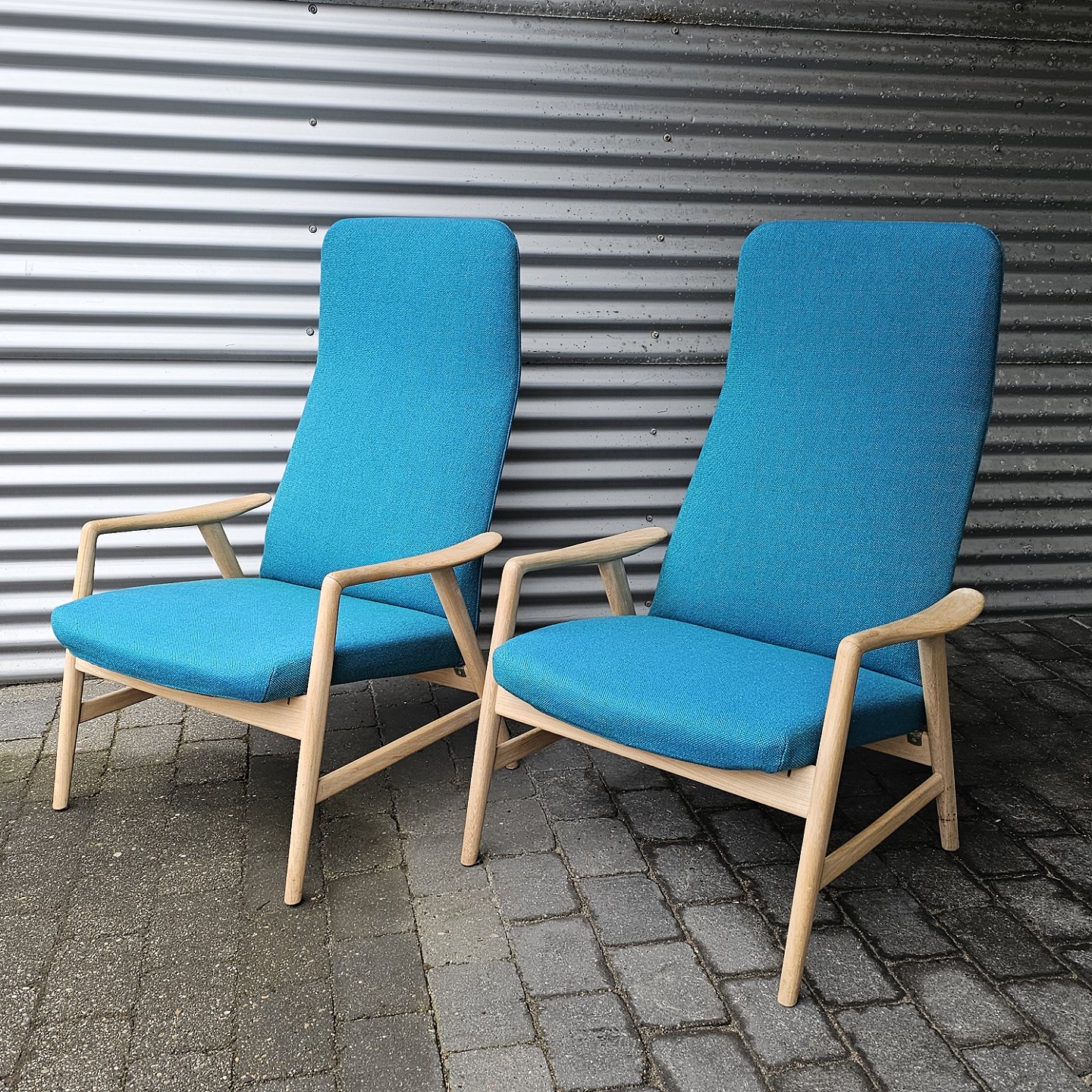 Sæt af to lænestole med træstel og sæde betrukket i blå Hallingdal uldDesigner Alf Svenson