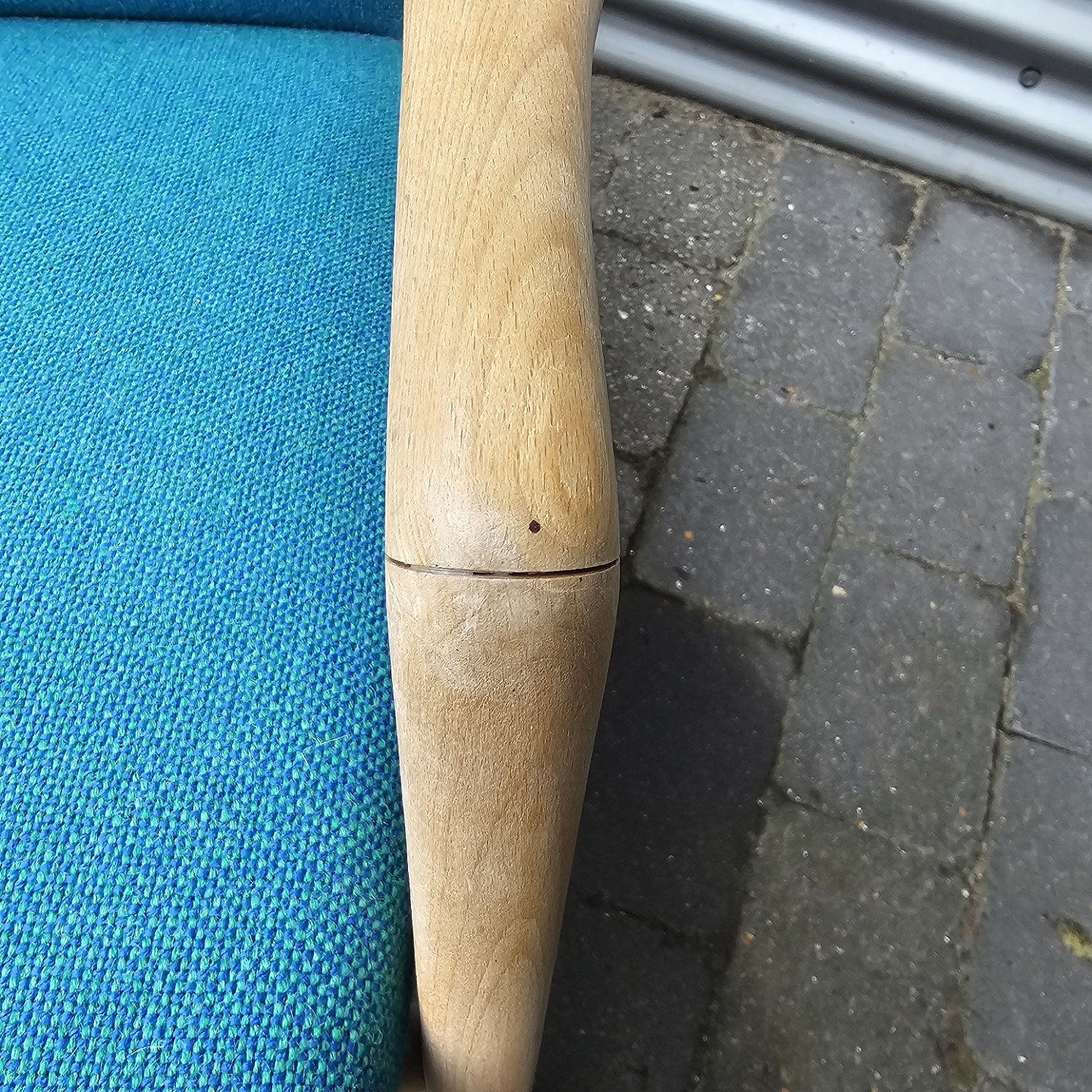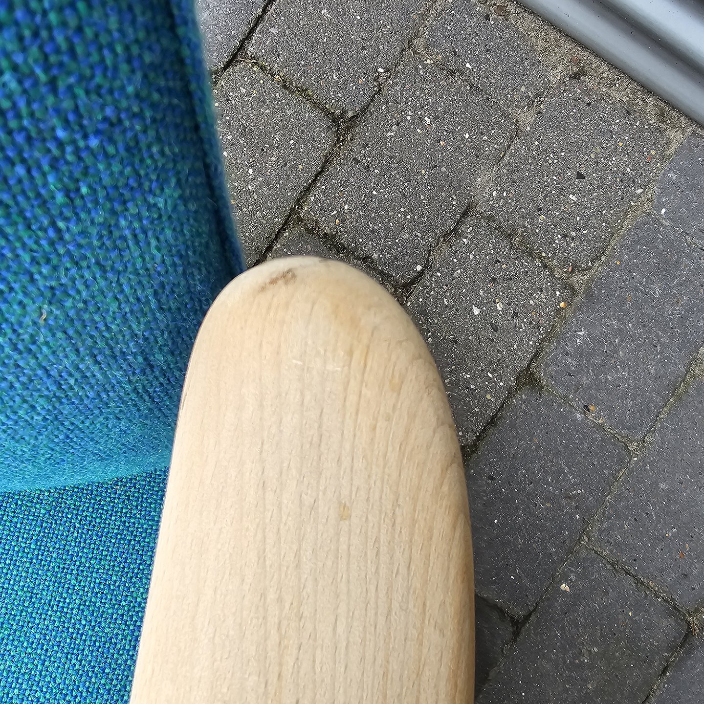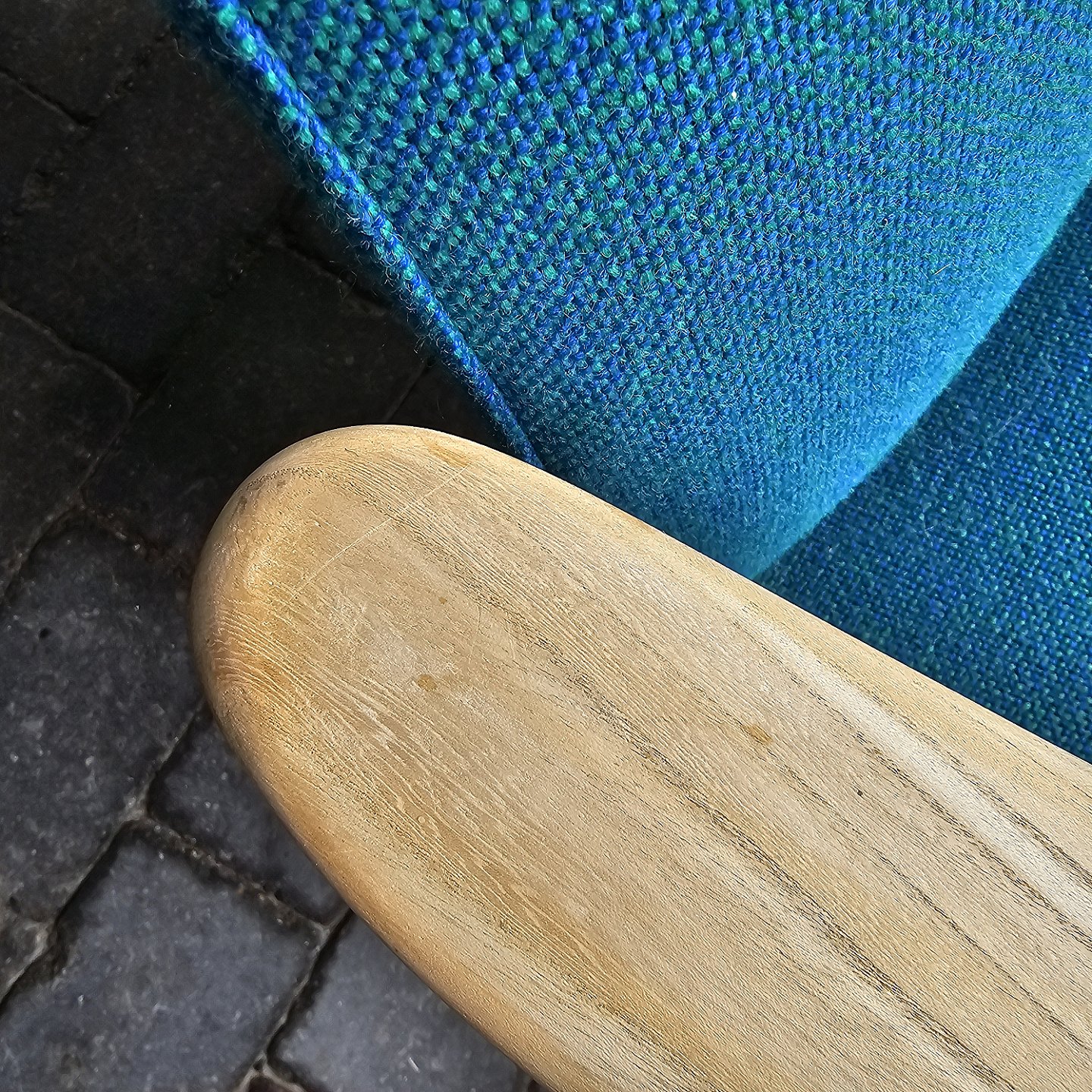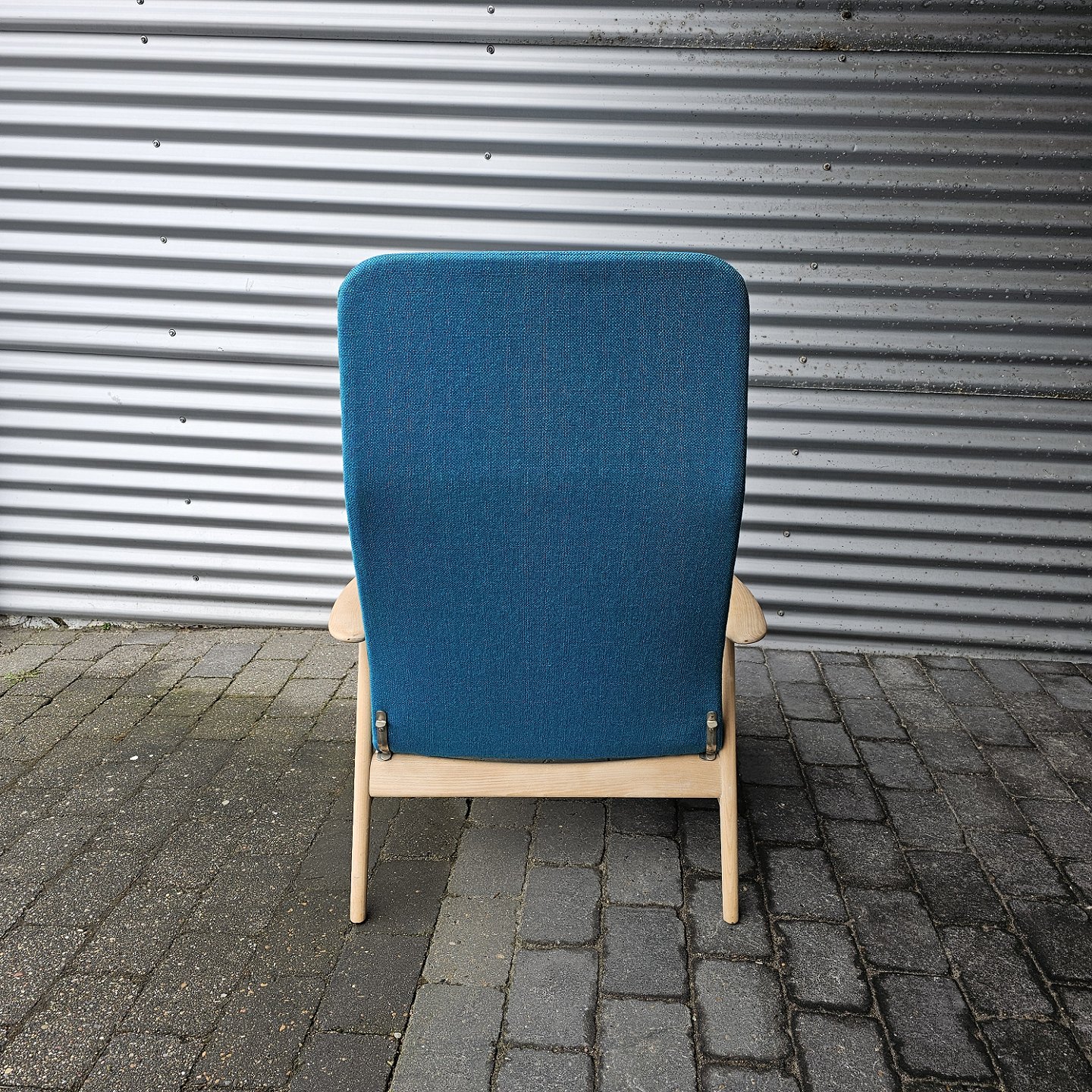 Sæt af to lænestole med træstel og sæde betrukket i blå Hallingdal uldDesigner Alf Svenson