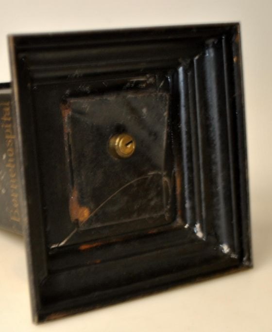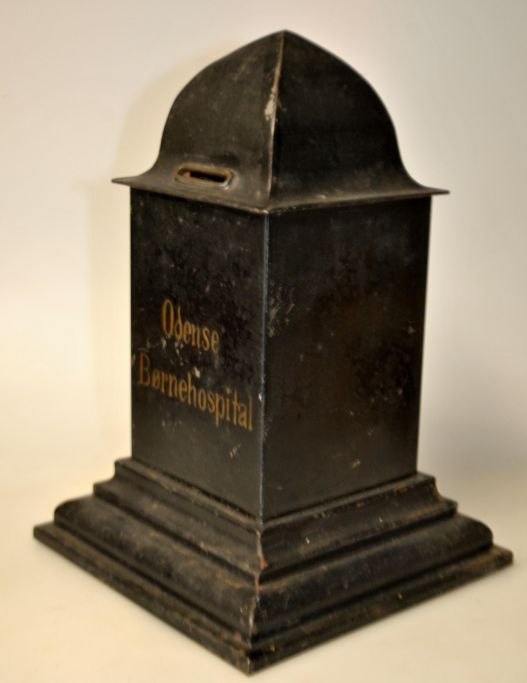 Collection box for Odense Children's Hospital, 19th century. Black-painted iron sheet. Gold-painted text. Height: 24 cm. On square base: 16 x 16 cm.NB: Truly rare!