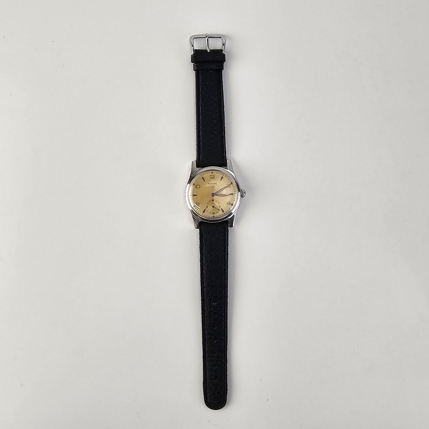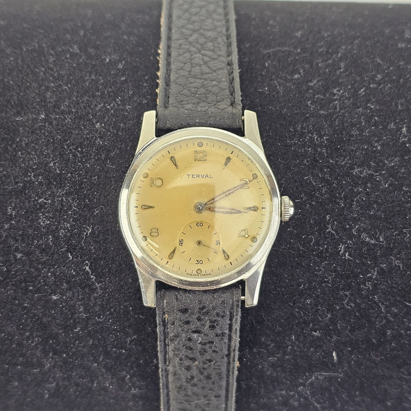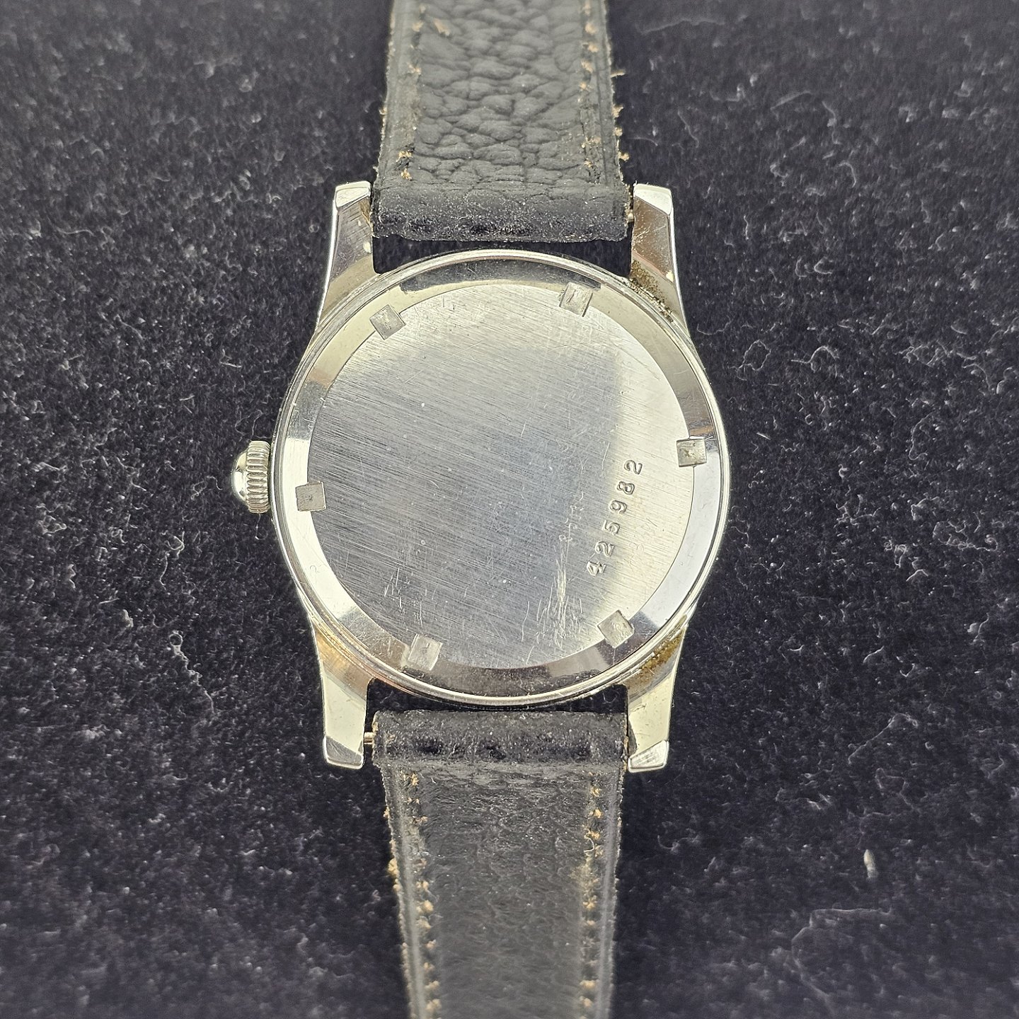 Armbåndsur med læderrem, stemplet med serienummer 425982Årgang 1950-1955, renset og pudset