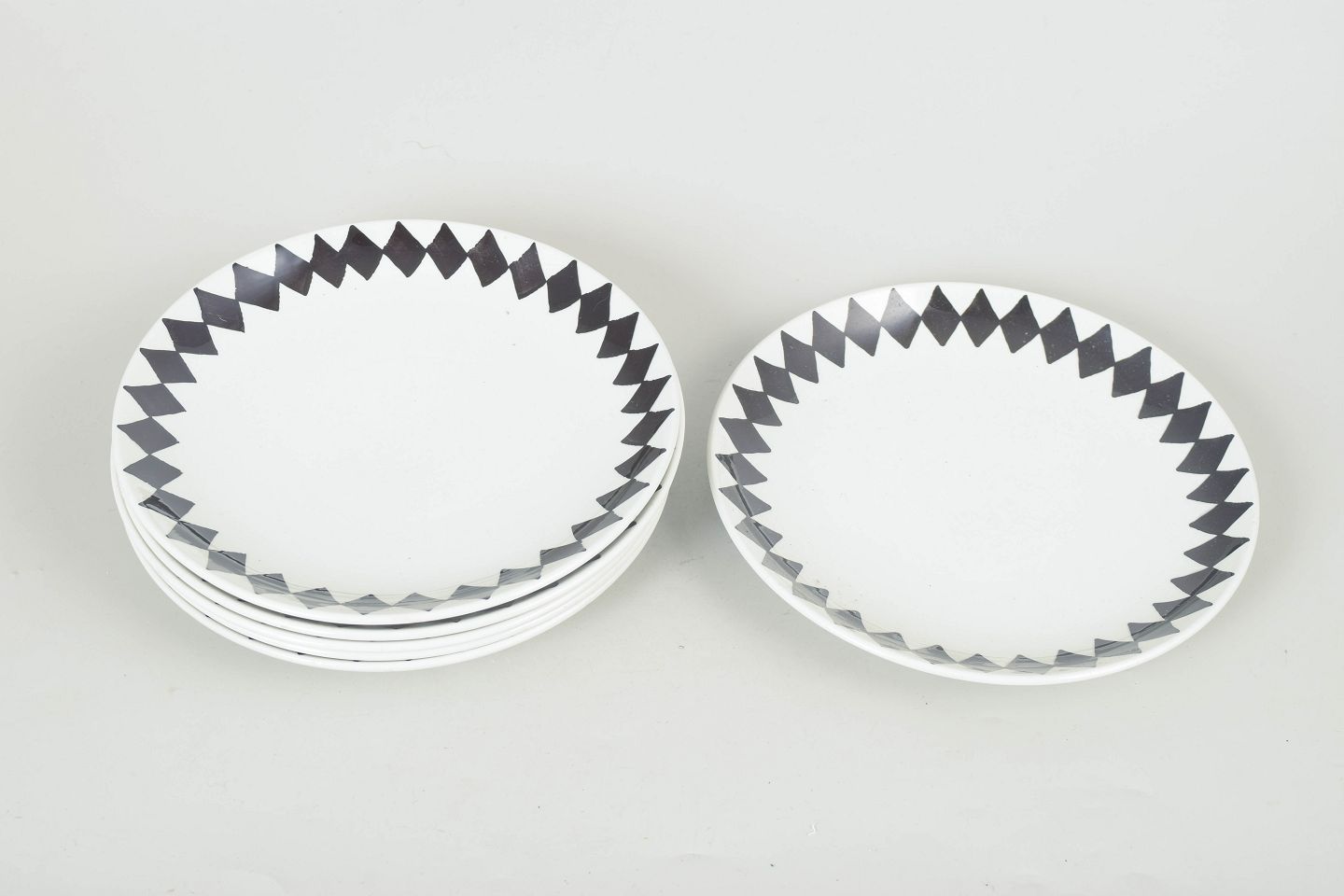 Karin Björquist for Gustavsberg, set of six small lunch plates “Svart Ruter”.Set consisting of six small lunch plates in porcelain featuring a distinctive black diamond pattern, designed in a simple and functional style typical of the period.