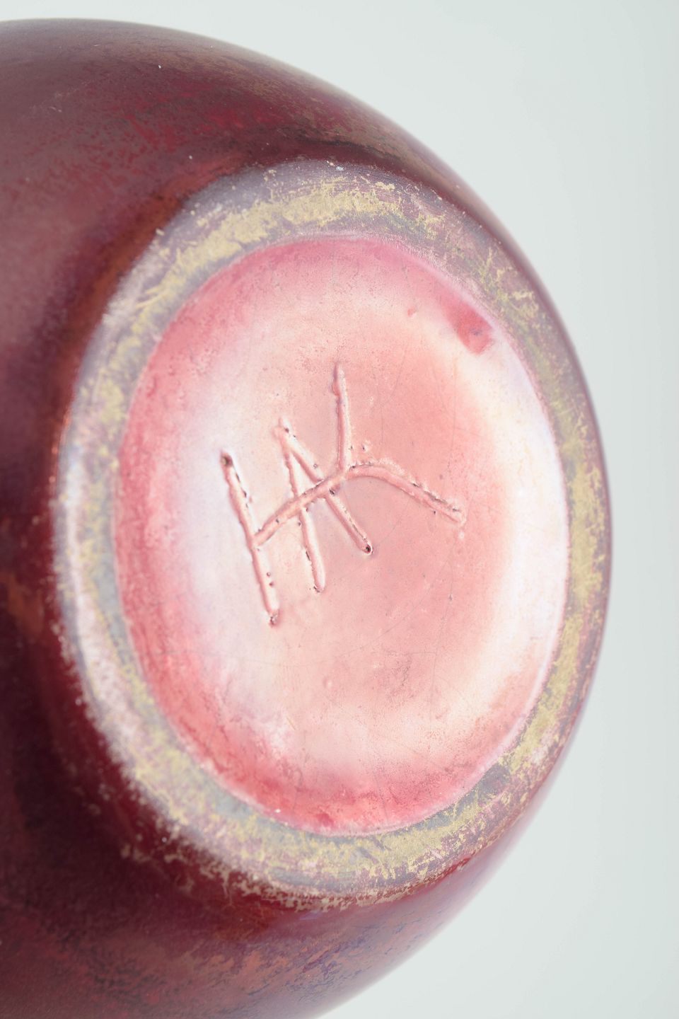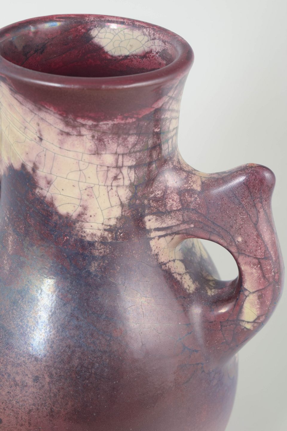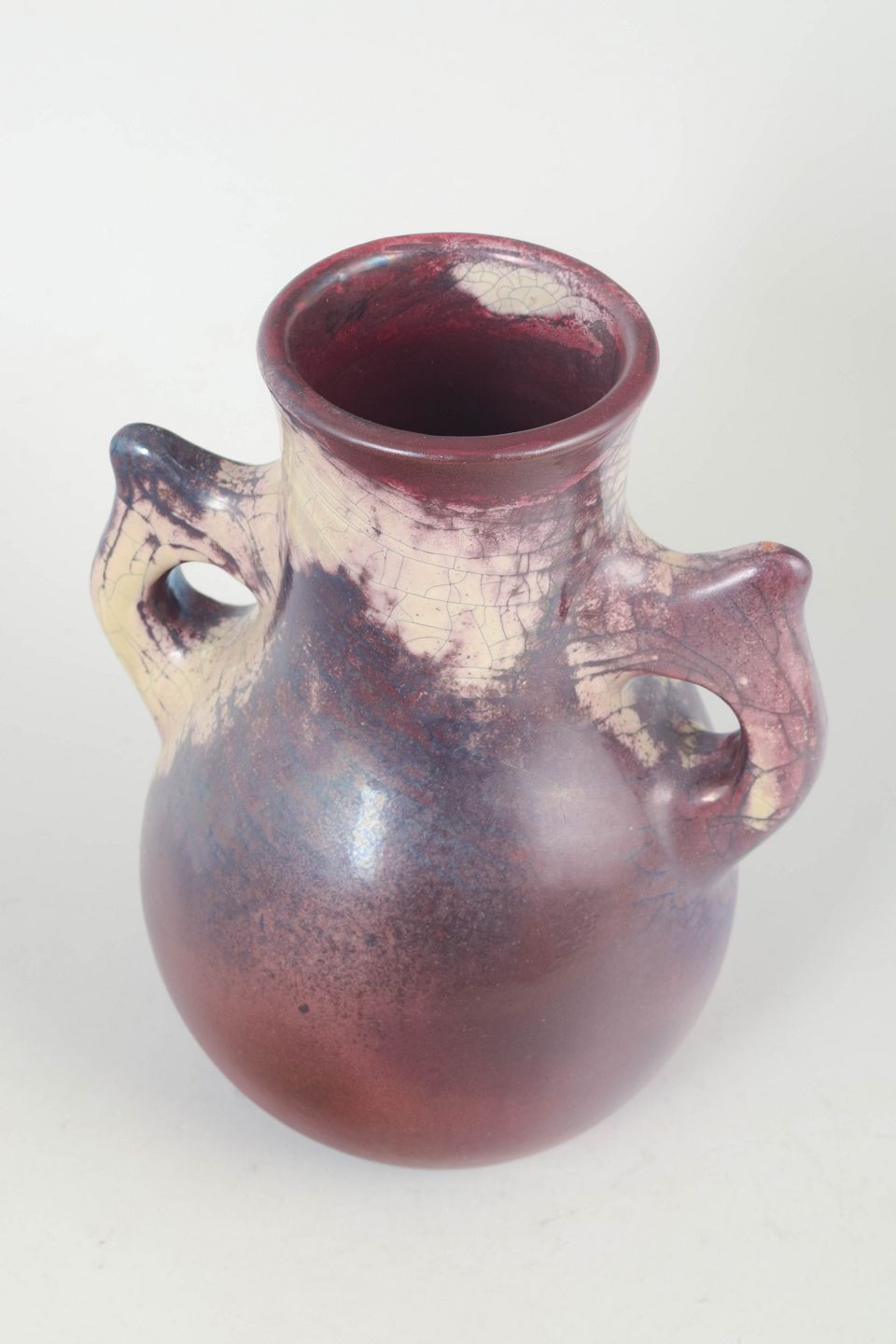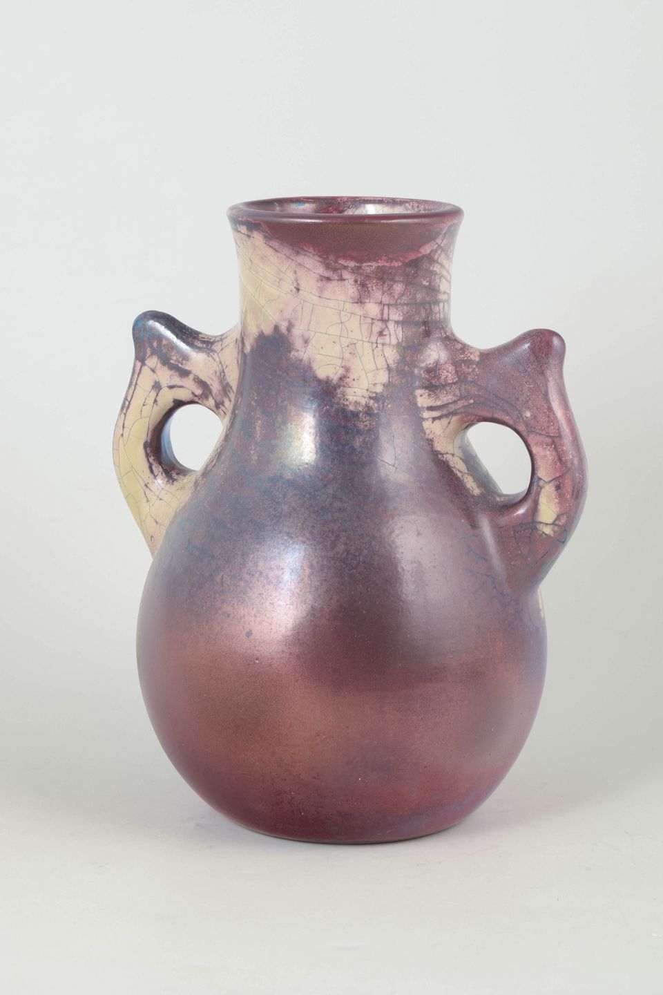 Karl Hansen Reistrup for Kähler, vase with handles.Decorative stoneware vase with iridescent lustre glaze in deep violet and metallic tones. The model features two characteristic handles and a rounded body, typical of Kähler’s artistic production in the late 19th century.