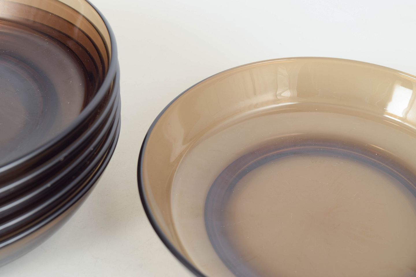 Vereco, set of six deep plates.Set of six deep plates in pressed glass with a low, wide form and smoky tint, produced in France and marked by the manufacturer.