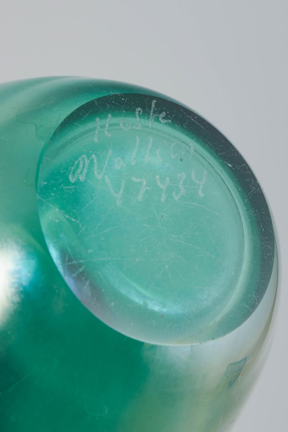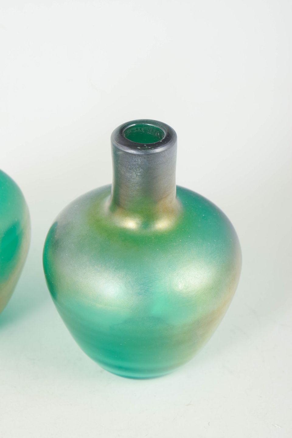 Elegant mouth-blown glass vases with organic form and iridescent surface in green and golden tones that shift in the light.