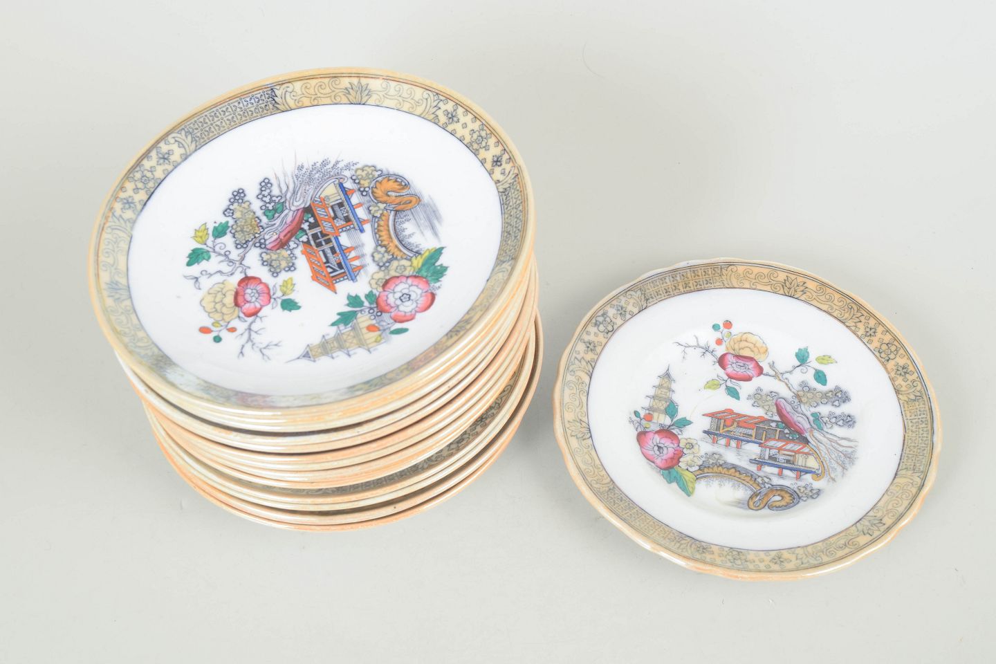 Rörstrand Japan, set of sixteen small plates.Decorative small faience plates with polychrome decoration in an orientalist Japanese style featuring pagoda motifs, buildings, bird and floral elements. Model Japan, produced between 1866–1925 and dated to the 1880s.