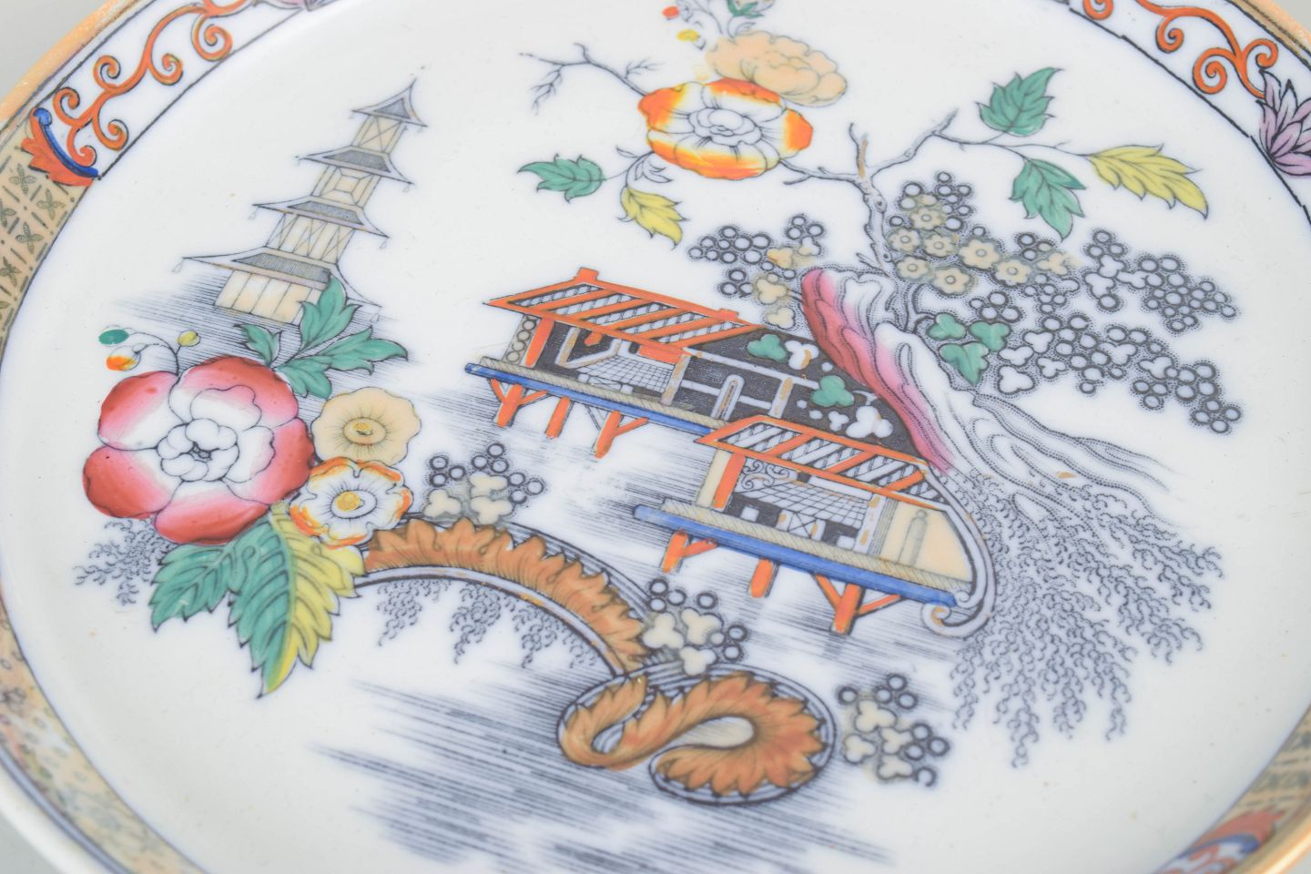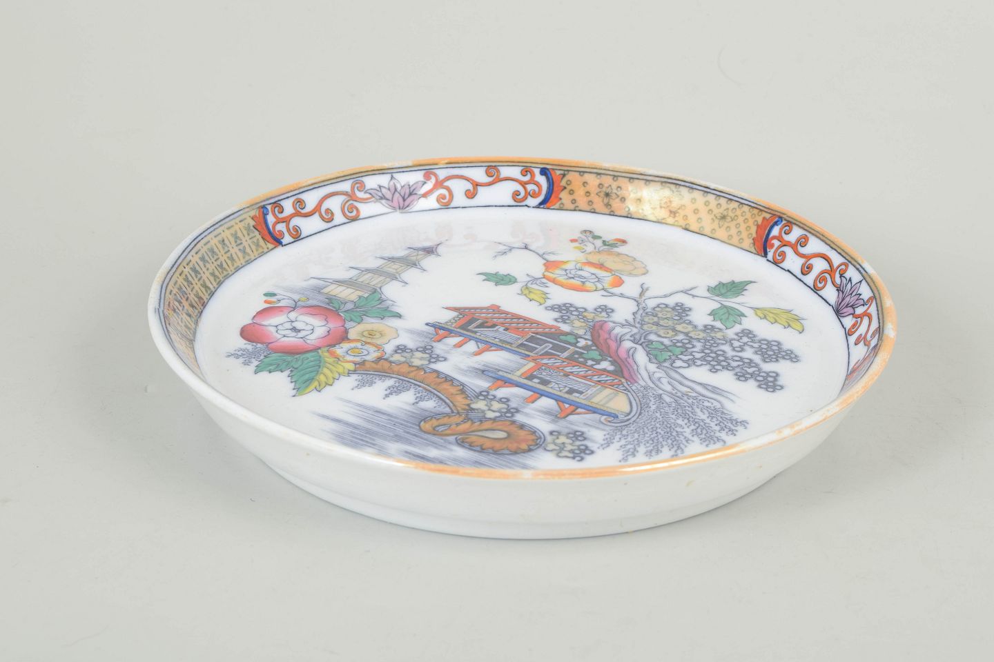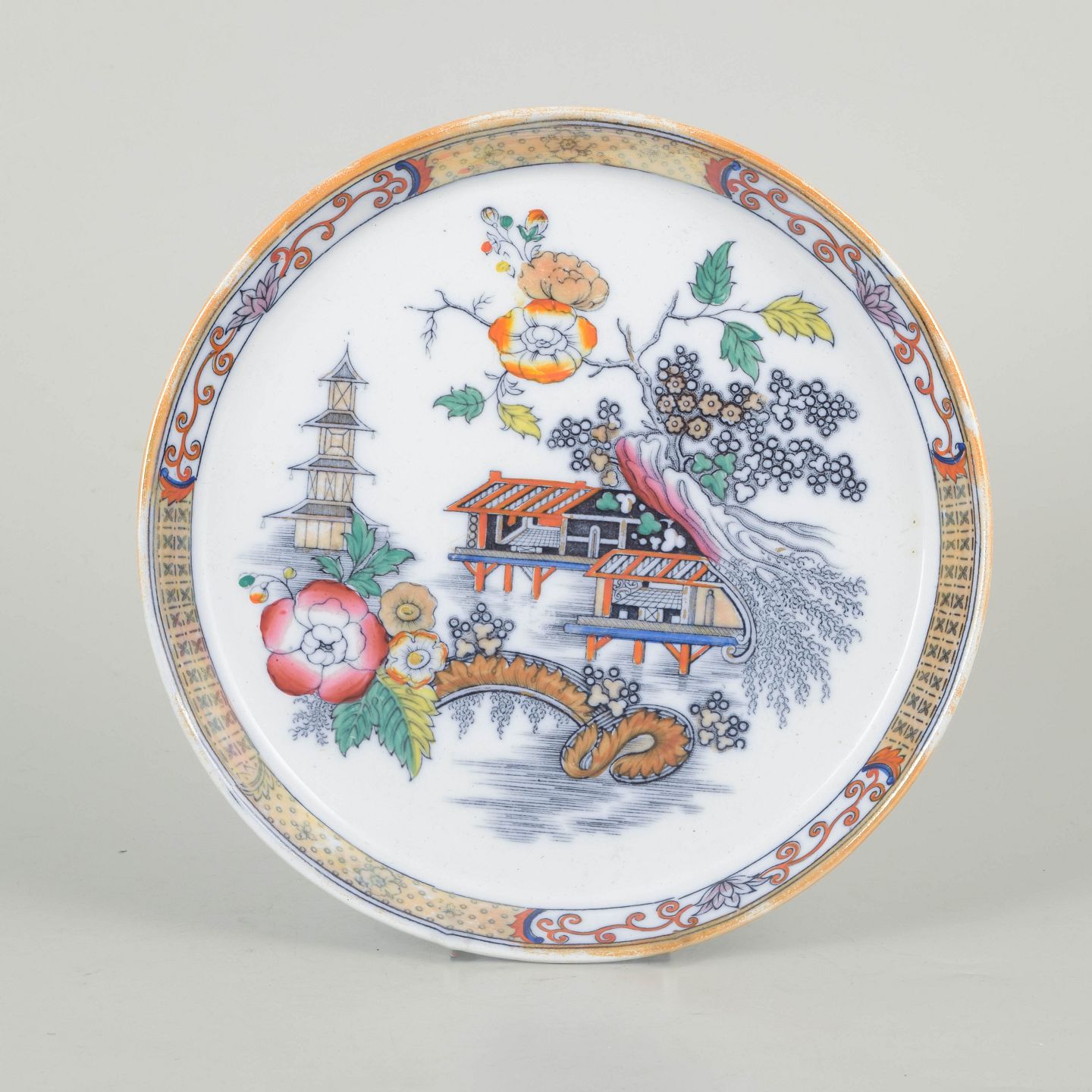 Rörstrand Japan, tray.Round faience tray with polychrome decoration in an orientalist Japanese style featuring pagoda motifs, buildings, bird and floral elements. Model Japan, produced between 1866–1925 and dated to the 1880s.