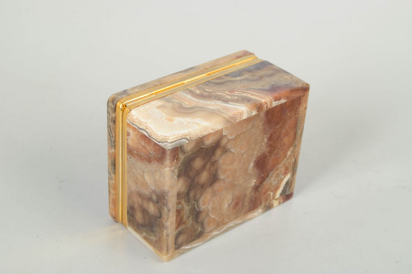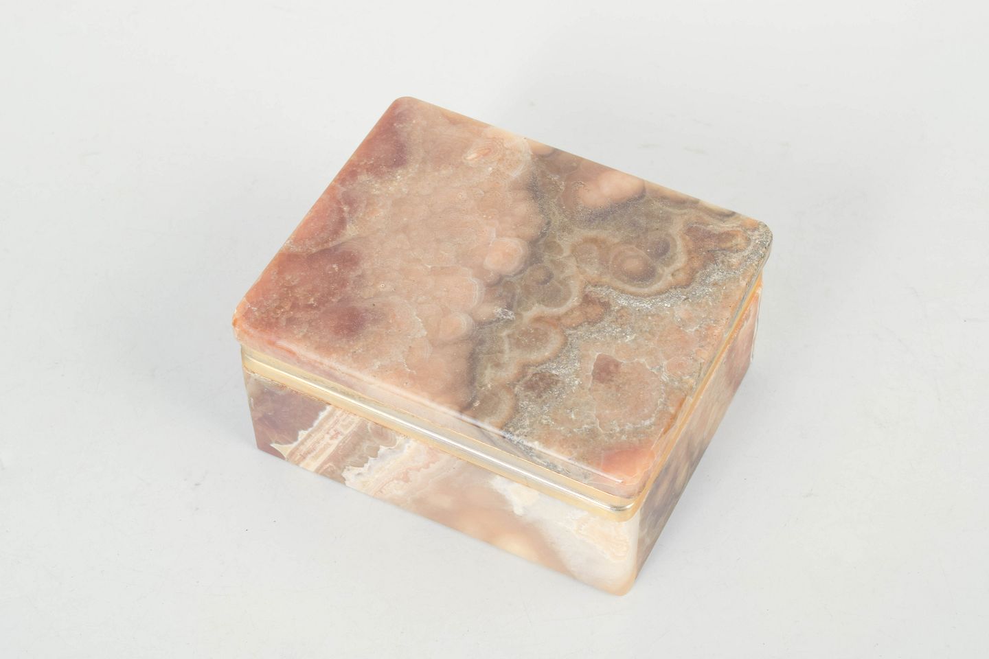 Italian alabaster, box from the 1940s.Square lidded box in alabaster with striking multicoloured veining in brown, beige and cream tones. Finished with an elegant brass band that emphasises the classic Art Deco aesthetic.