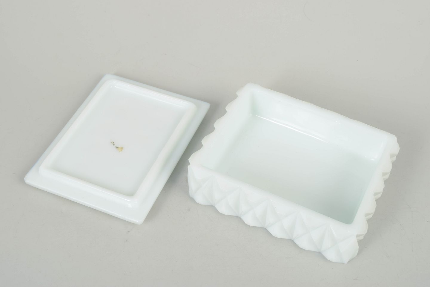 Italian opaline glass, box from the 1940s.Rectangular lidded box in opaline glass with geometric relief decoration of repeating pyramid motifs. The white material has a subtle translucency that enhances the structured Art Deco design.