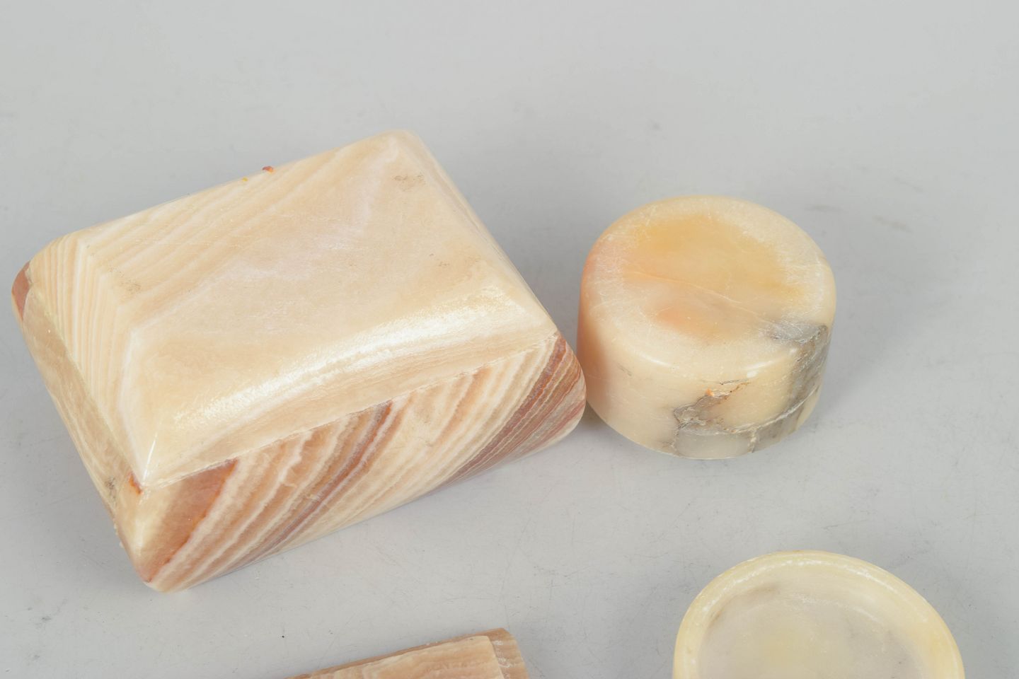 Italian alabaster, boxes from the 1940s.Two decorative boxes in polished alabaster with natural veining in warm beige and honey tones. Comprising one square lidded box and one circular box, both reflecting a characteristic Art Deco aesthetic.