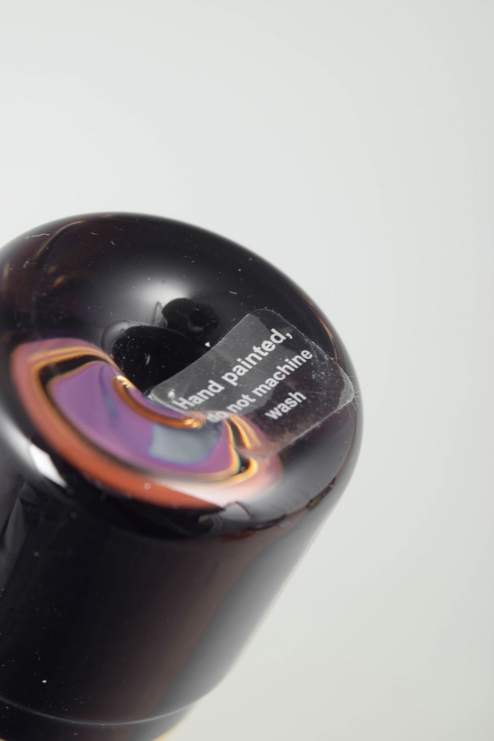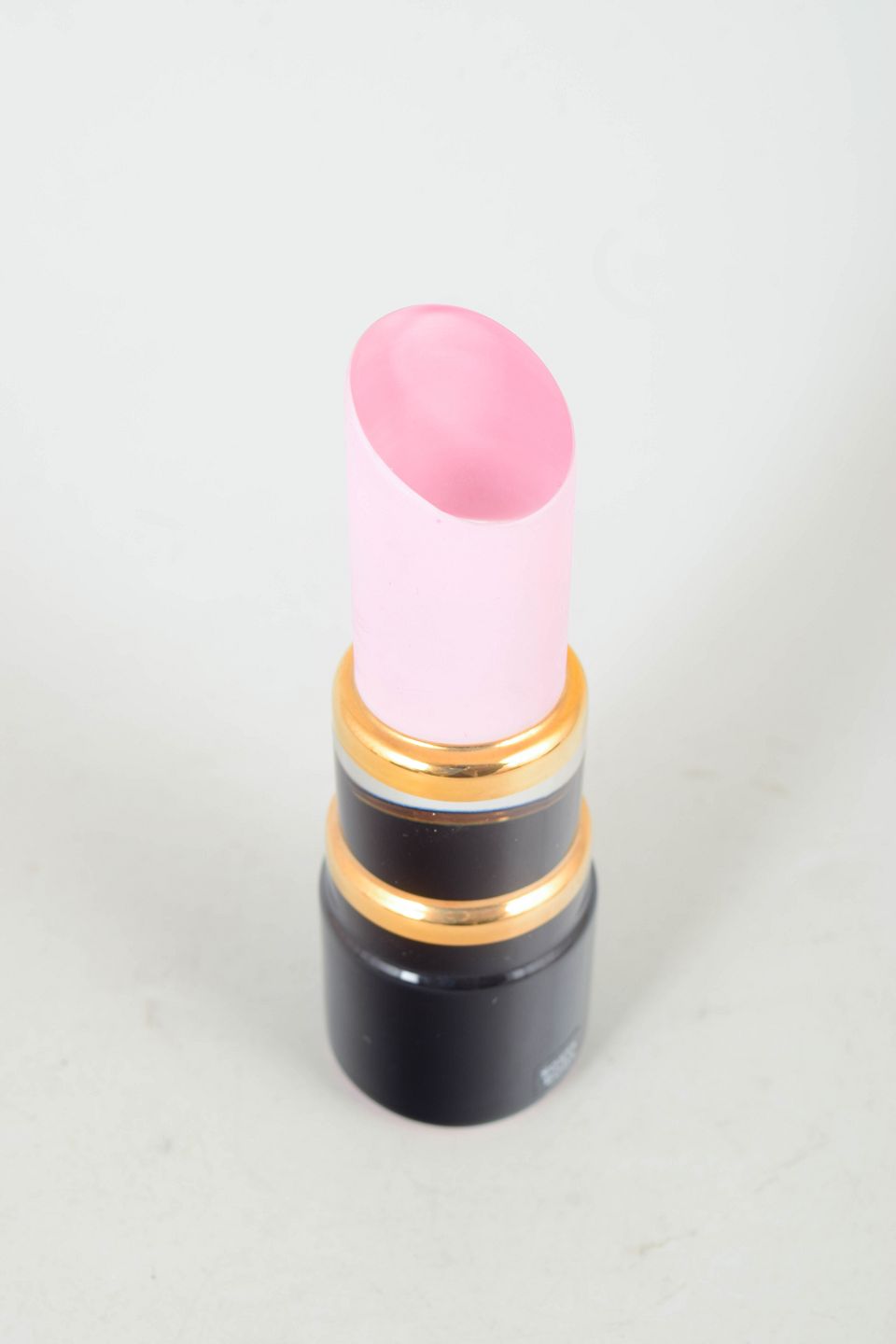 Åsa Jungnelius for Kosta Boda, glass sculpture in the form of a lipstick.Slender layered glass sculpture in the form of a lipstick, with a cylindrical base in dark glass, ring-shaped elements in golden and clear tones, and an angled top in pink glass.
