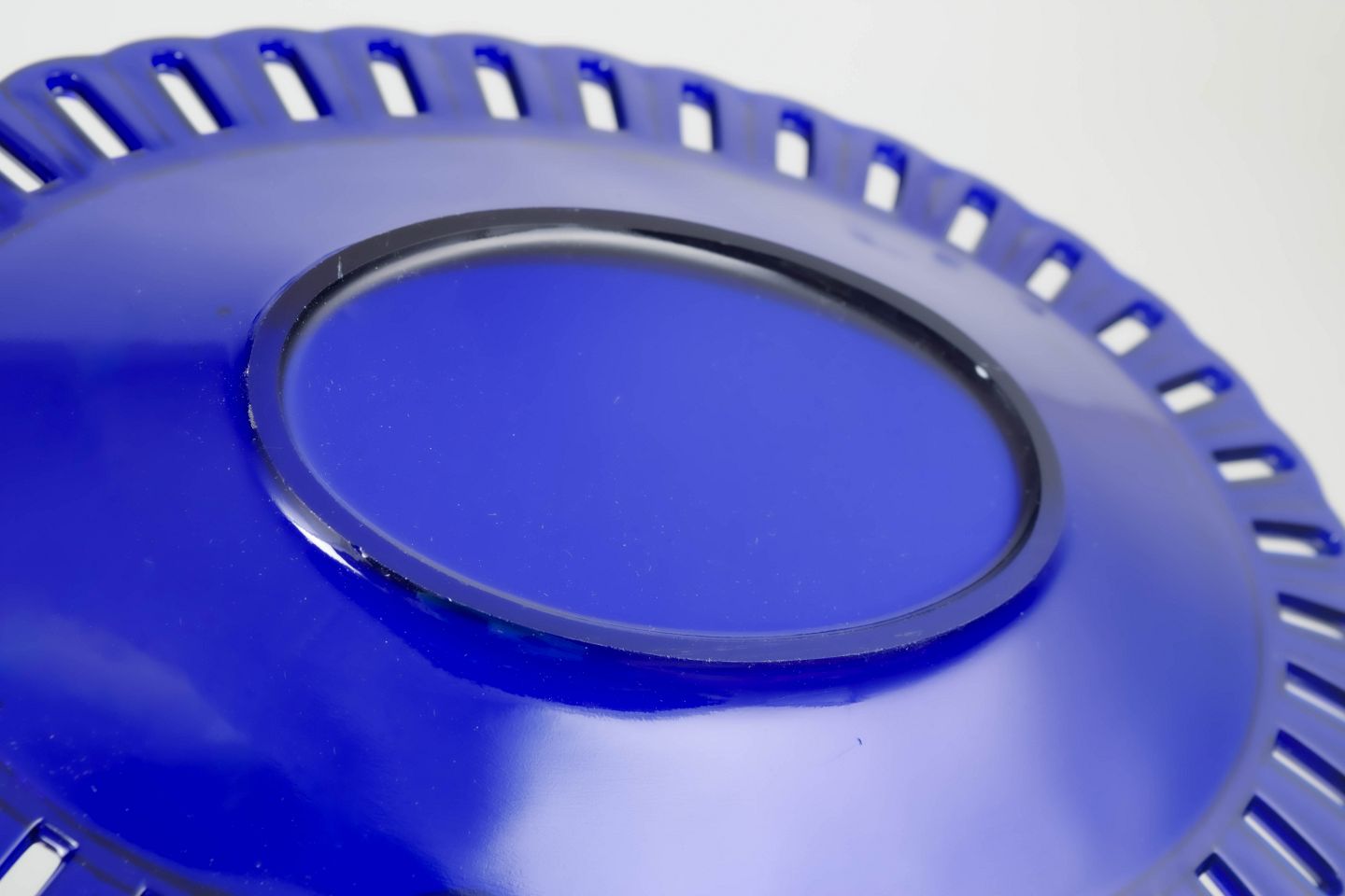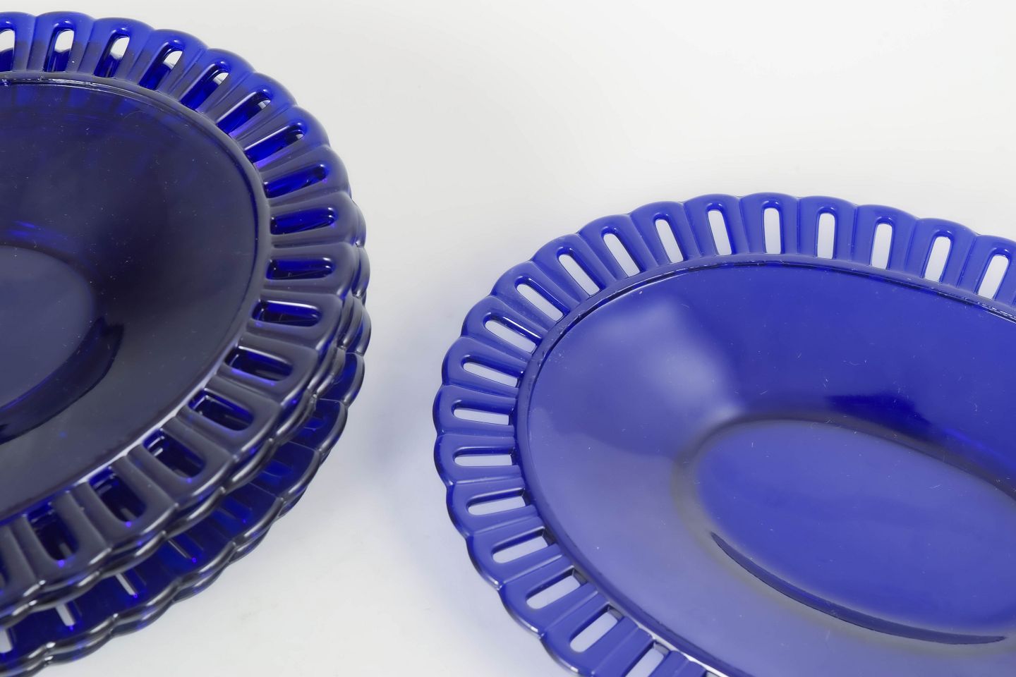 William Stenberg for Gullaskruf, set of six “Filigran” plates.Elegant pressed glass plates in deep cobalt blue with a distinctive openwork rim in filigree design. A striking example of Swedish glass design from the mid 20th century.