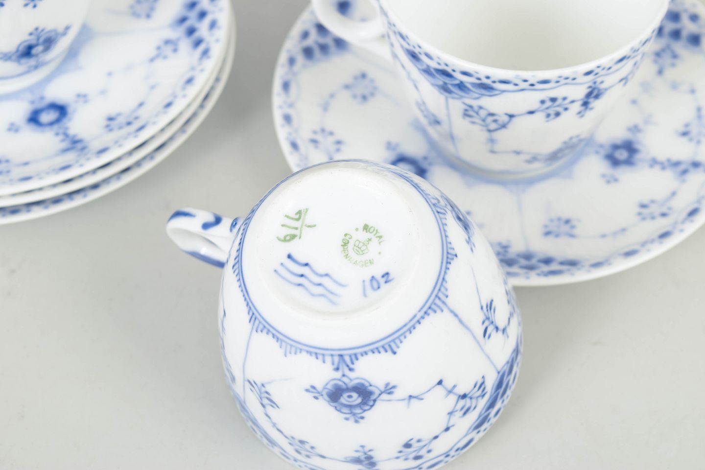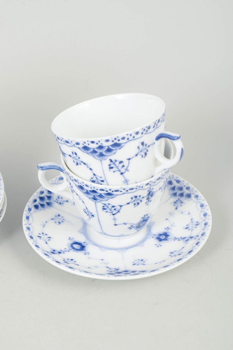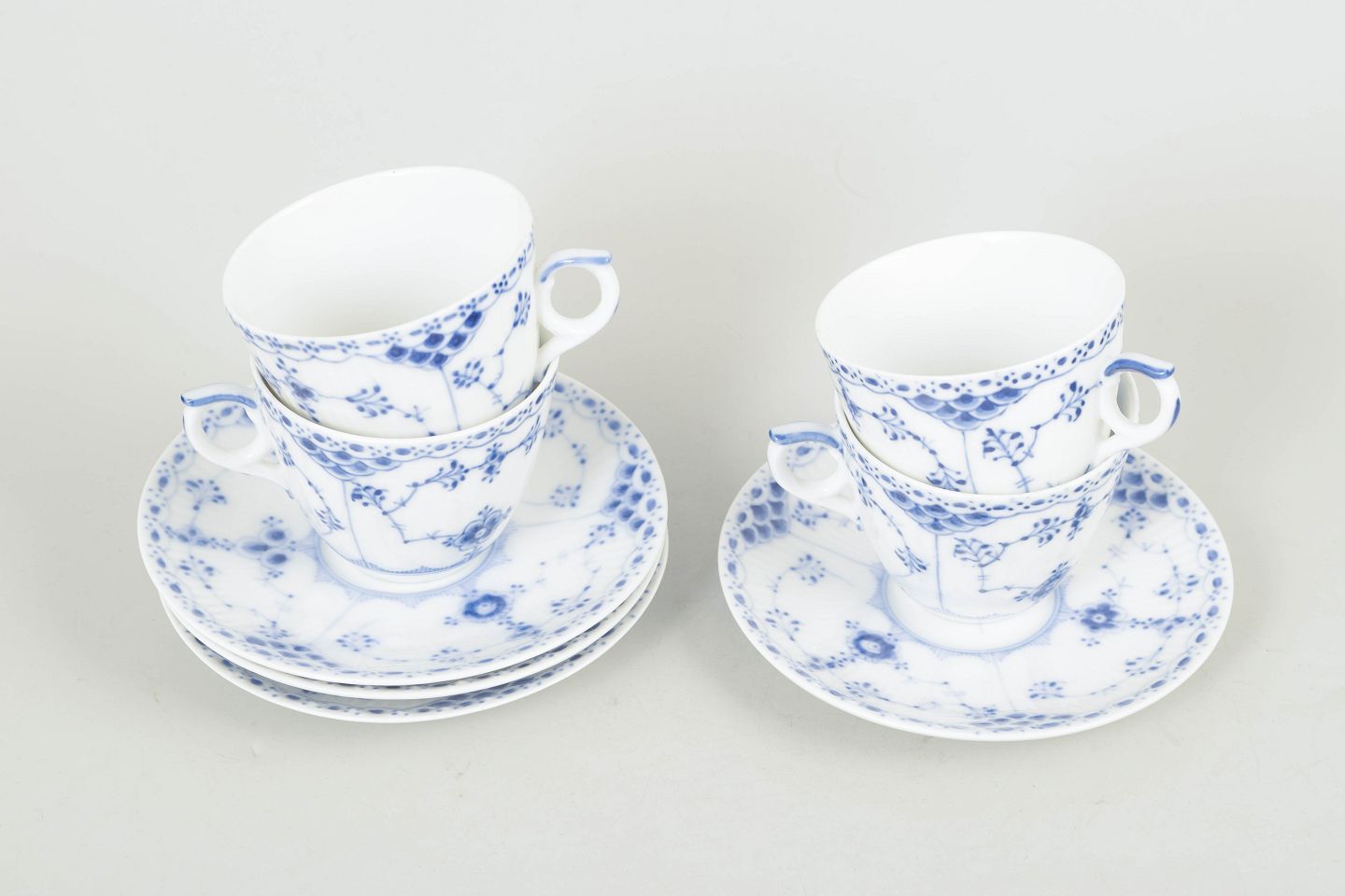 Royal Copenhagen Blue Fluted Half Lace, set of four coffee cups with matching saucers.Hand-painted coffee cups with matching saucers in porcelain with the Blue Fluted Half Lace decoration, model 1/719, first factory quality.