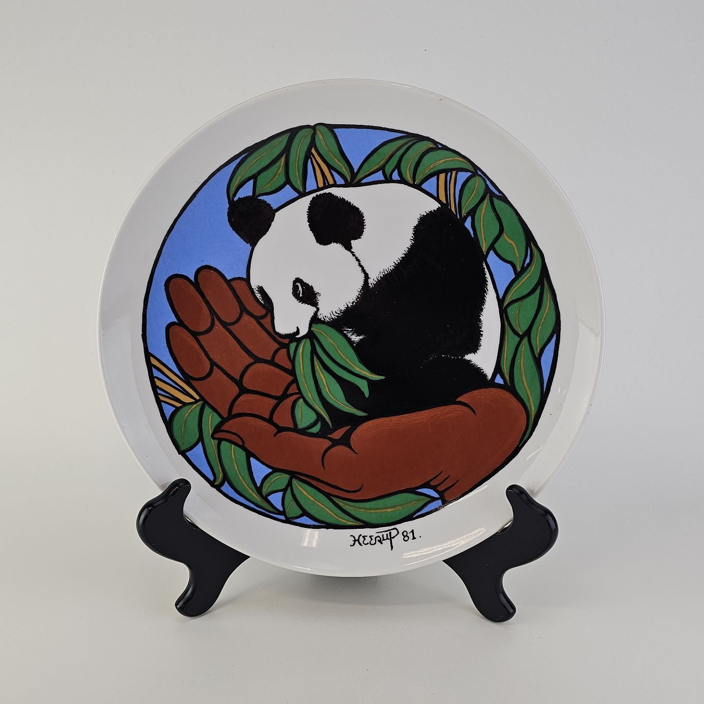 Platte af kongeligt porcelæn med motiv af en panda, som sidder i en åben hånd. Nr. 307/1000Signeret Heerup 1981 og dedikeret til Verdensnaturfondens arbejde med truede dyrearter