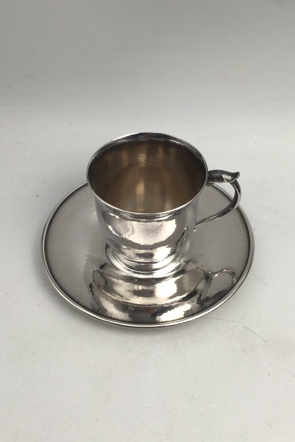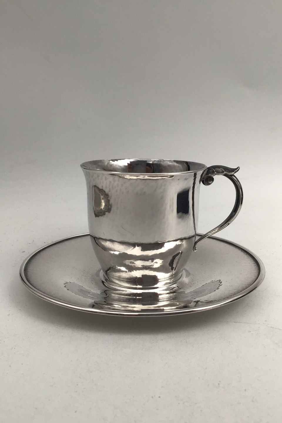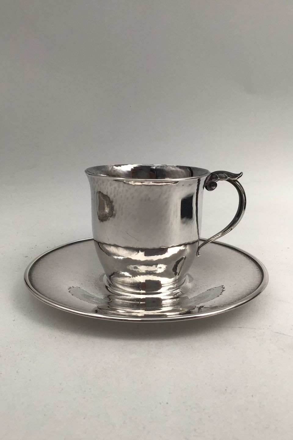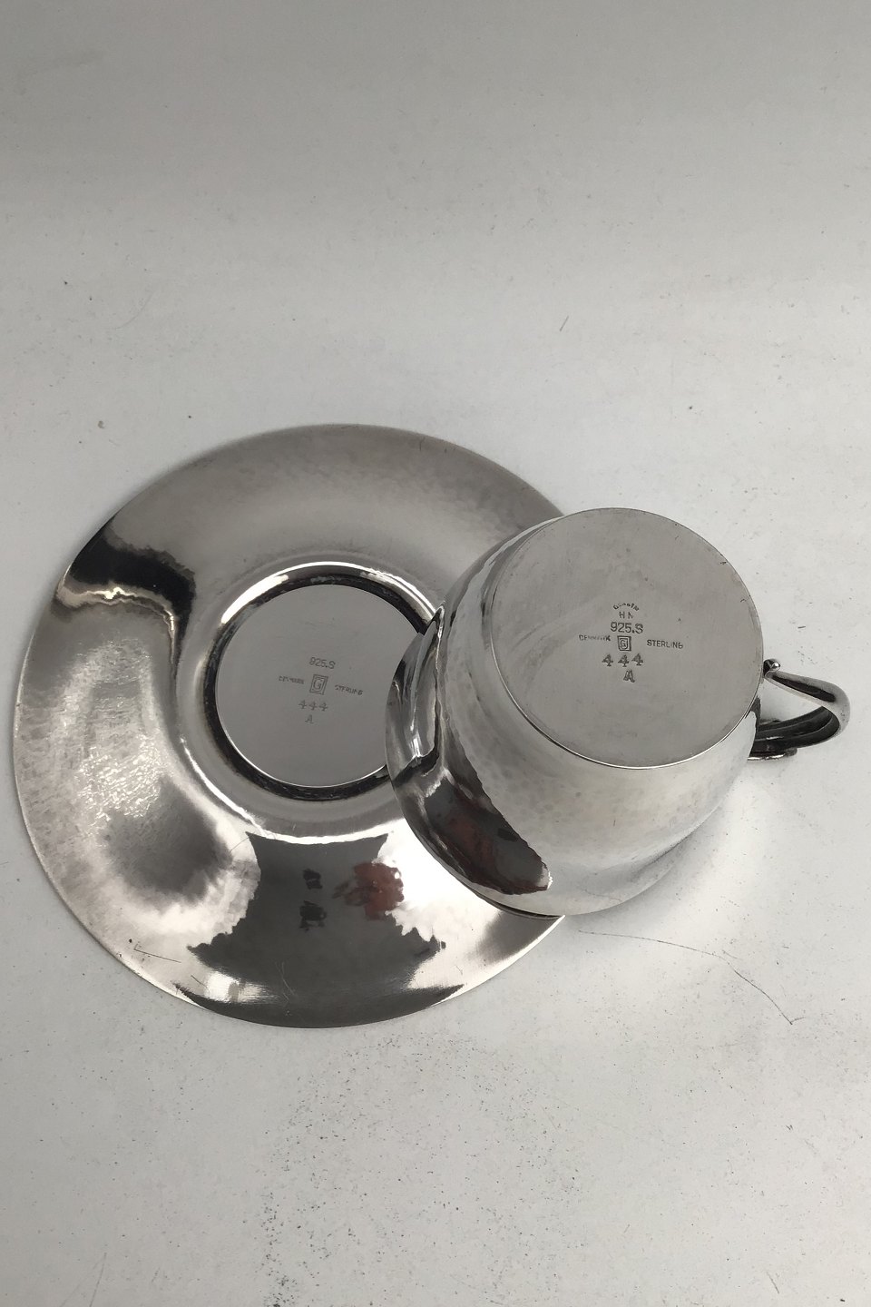 Georg Jensen Sterling Silver Cup / Saucer No. 444 A. (1930 - 1945)Measures Cup Diam 6.5 cm (2.55 inch) H 5.9 cm (2.32 inch) Weight 91.62 gr/ 3.23 oz. Saucer Diam 12.5cm (4.92 inch) Weight 85.85 gram (3.02 oz.)