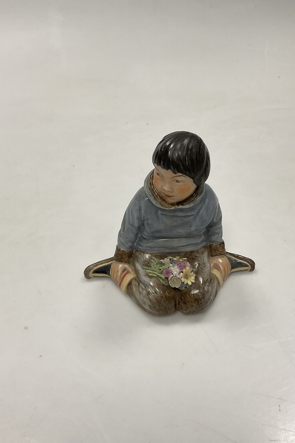 Royal Copenhagen Overglaze Figurine - Boy with Flowers from Greenland No. 12419. Designed by Carl Martin-Hansen. Perfect condition. Measures 9.5 cm / 3.74 in. 1st QualityStock: 1