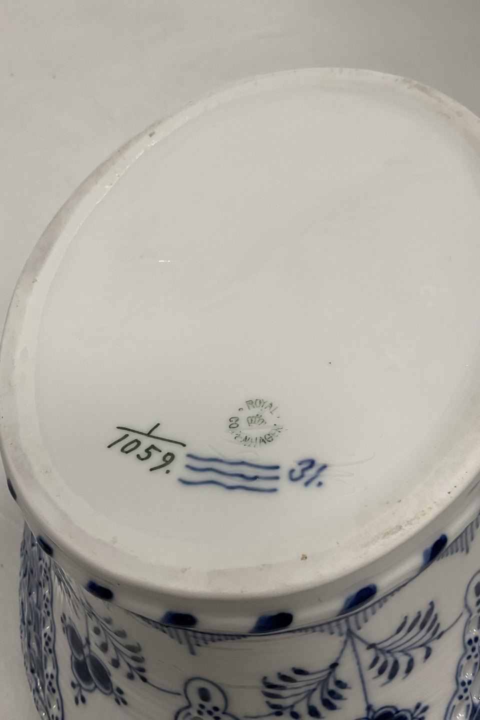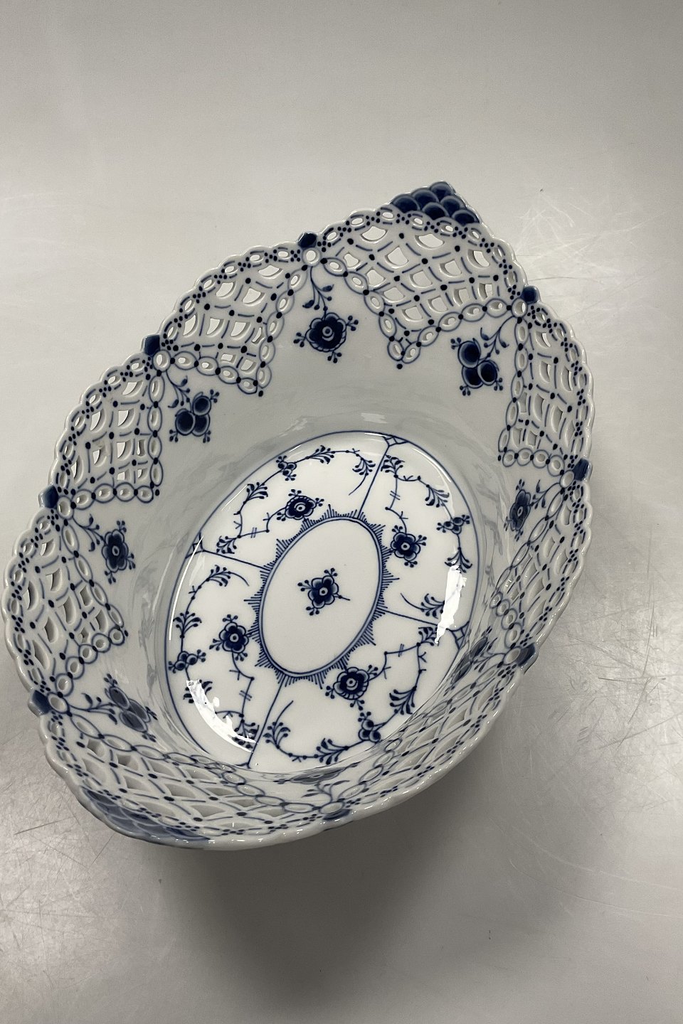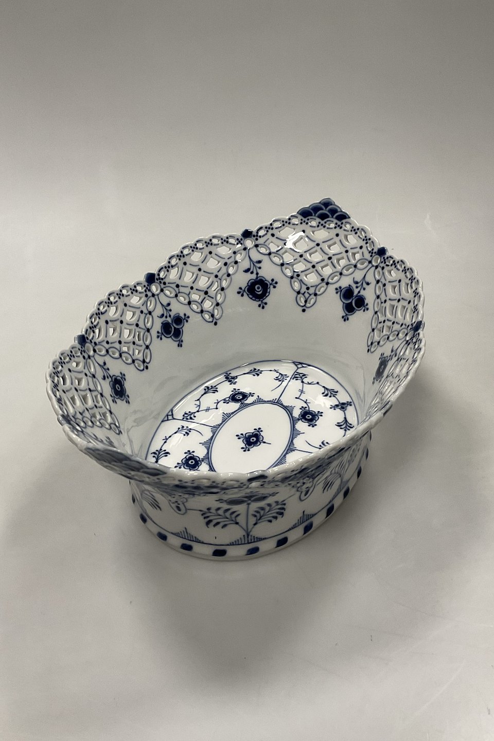 Royal Copenhagen Blue Fluted Full Lace Fruit Basket/Oval Bowl No. 1059. Modeled by Emil Larsen, November 1892.Measures 30 cm x 21 cm / 11.81 in. x 8.26 in. 1st Quality