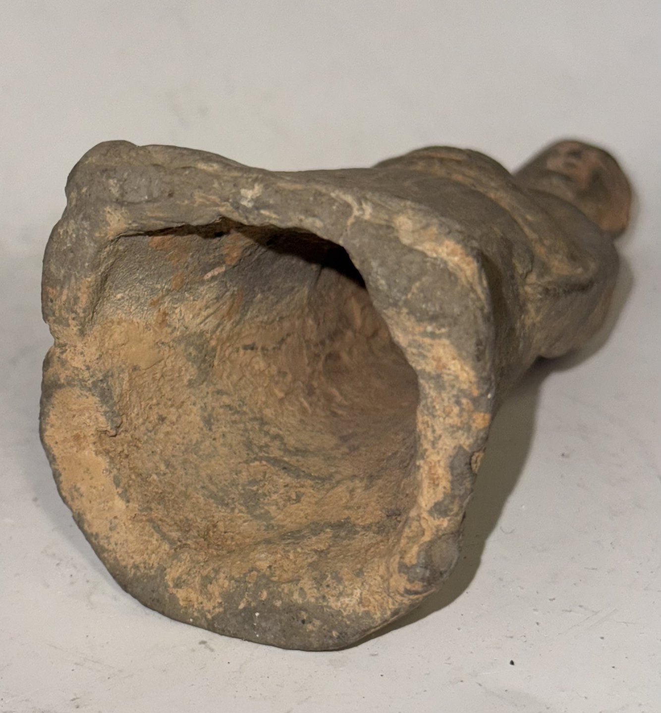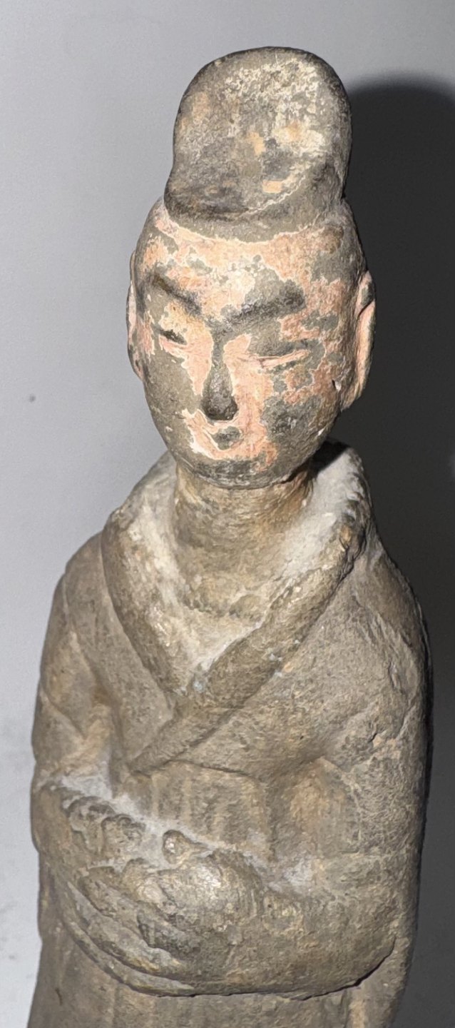 Chinese ceramic grave figurine from the Tang Dynasty (618-907 AD). This type of figurine was placed in the grave with the deceased. The figurine could, for example, symbolize a servant or maidservant for the afterlife. This figurine has probably been fully glazed, but only remnants of glaze are visible on the face. No damage or repairs. H. 14.5 cm Dealer