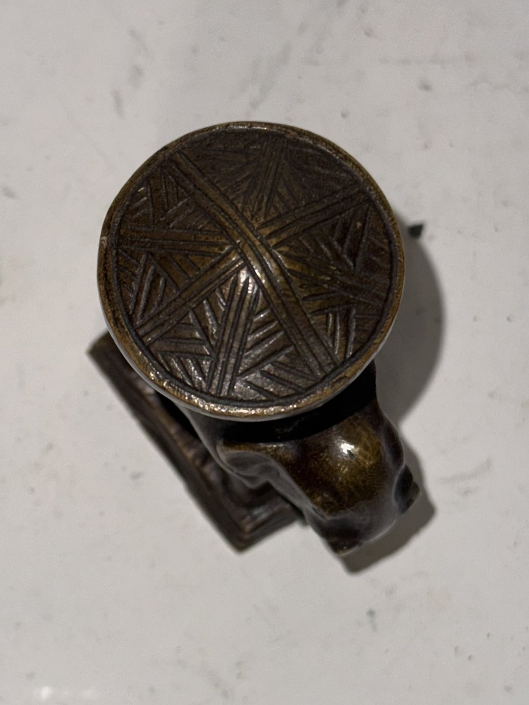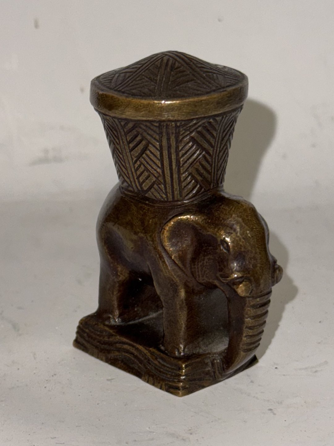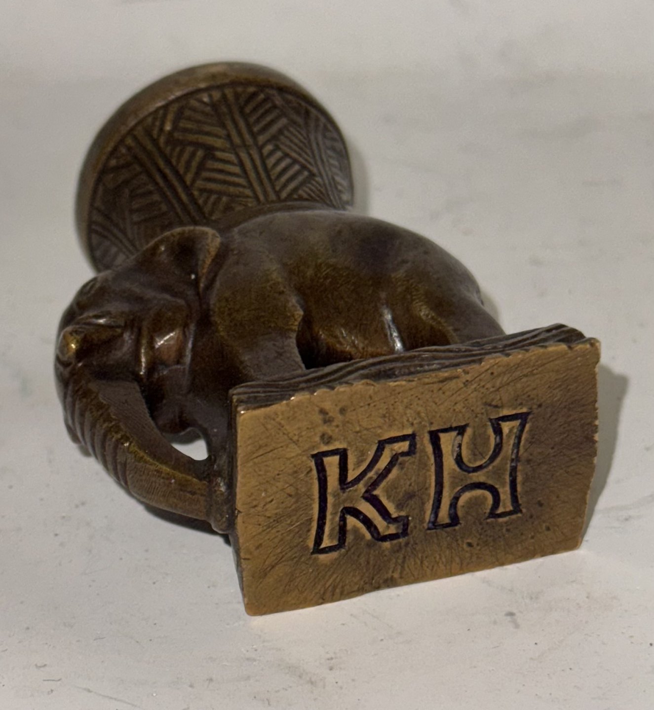 Mogens Ballin (1871-1914): Figure of elephant with basket on back in bronze. Cast in one piece. In good condition. On the bottom engraved KH. Not stamped with artist initials. Previously sold a similar figure by Mogens Ballin in pewter, which functioned as a flintlock. The pewter version had model number T135. H. 6.8 cm. Dealer
