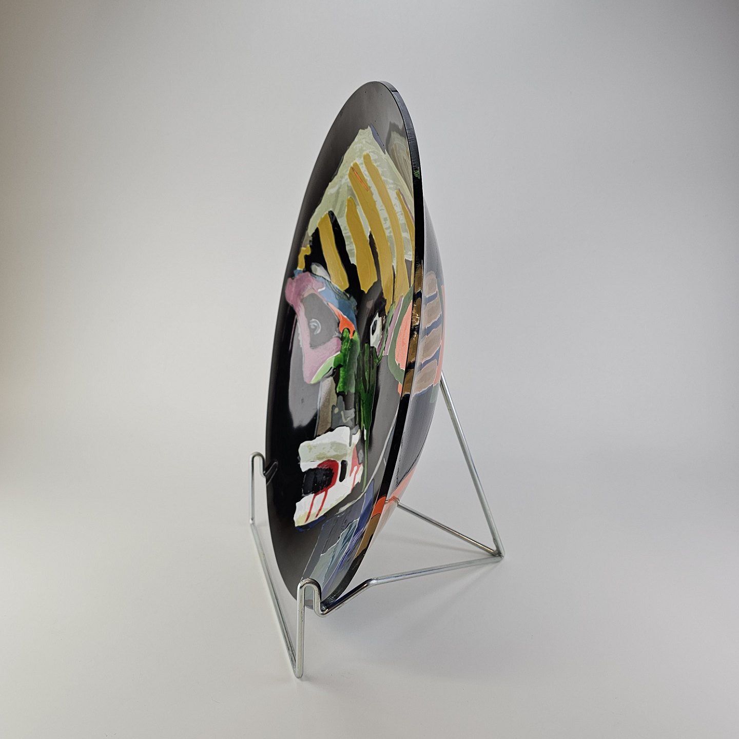 Platte i glas med abstrakt motiv i flere farver på sort baggrundNr. 29/100, medfølgende metal holder.