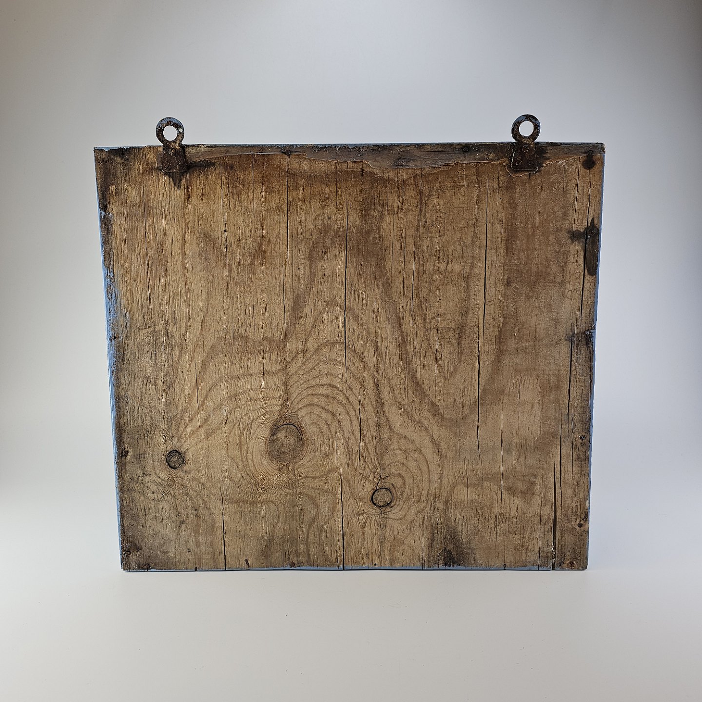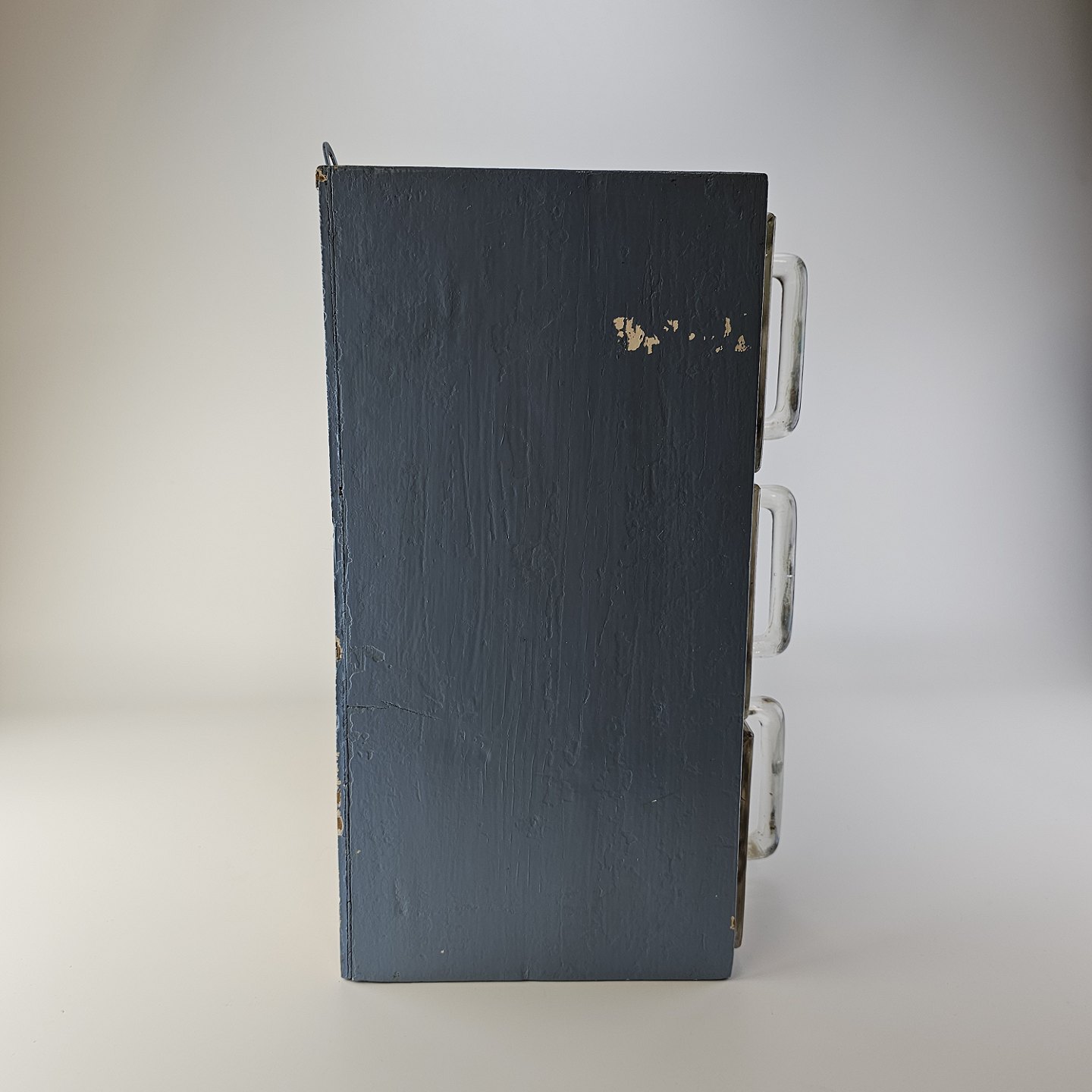 Flot patineret krydderihylde i blåmalet træ med skuffer af glas og to træskeer. Har 6 store skuffer og 6 små skufferProducent af nogle af glasskufferne VEWAG Eschebach. Formentlig dansk produceret.