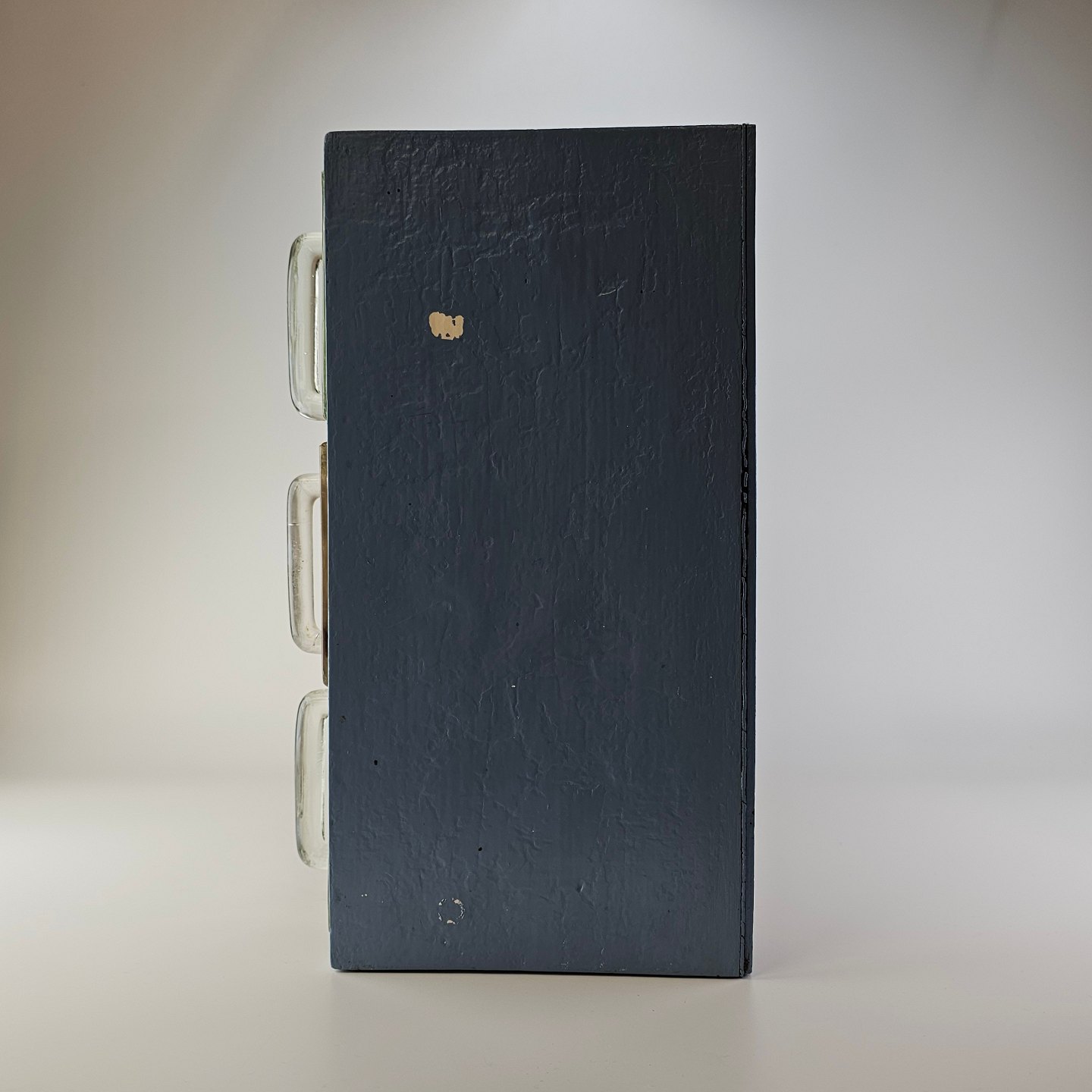 Fremstår med brugsspor på malingen på begge sider, små mærker på glas skufferne og et afslag på bagsiden af den ene skuffe