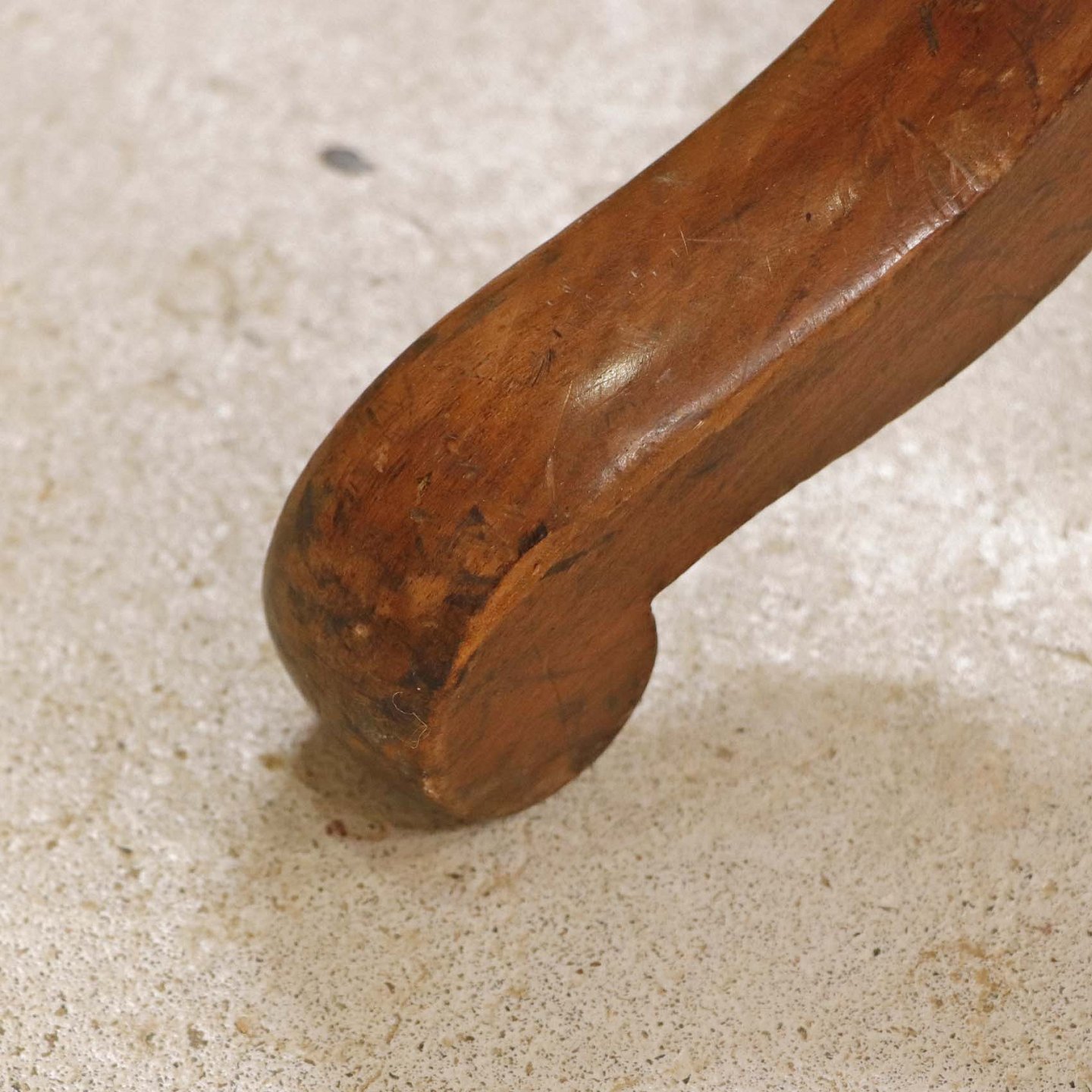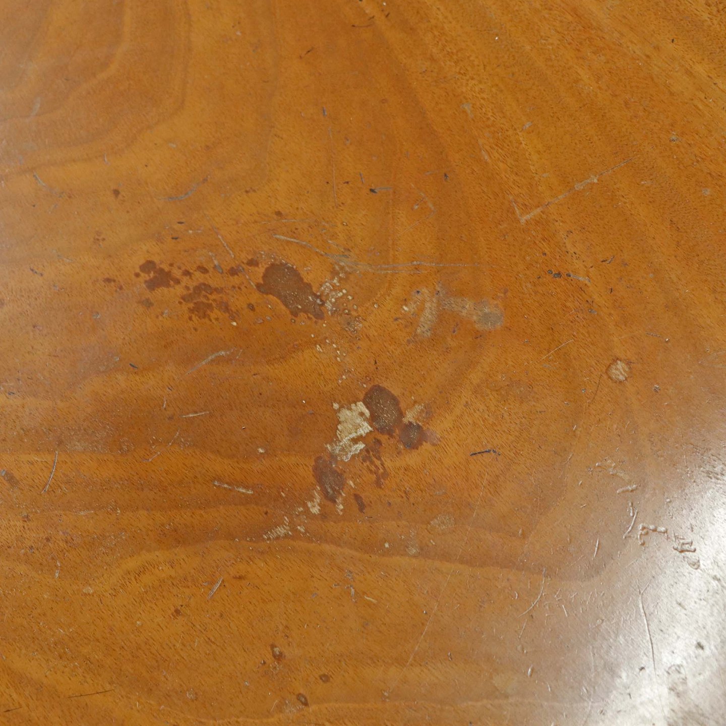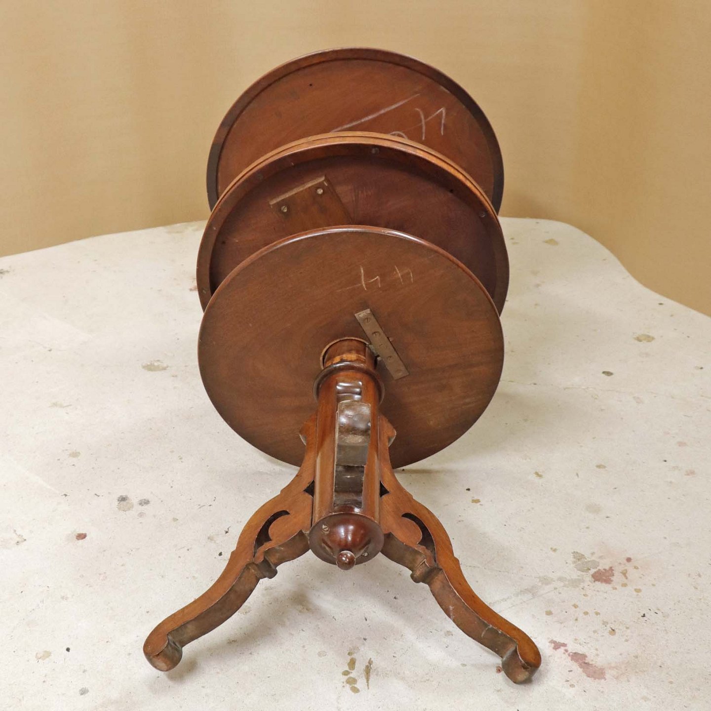 Et ældre serveringsbord på tre fødder i lakeret maghoni med tre etager. Opsatsdelen kan slås sammen til et bord.Bordtypen kaldet en Dumbwaiter blev oprindeligt lavet i England i midten af det 18. århundrede, og brugt til opbevaring af mad-og drikkevarer i spisestuer.