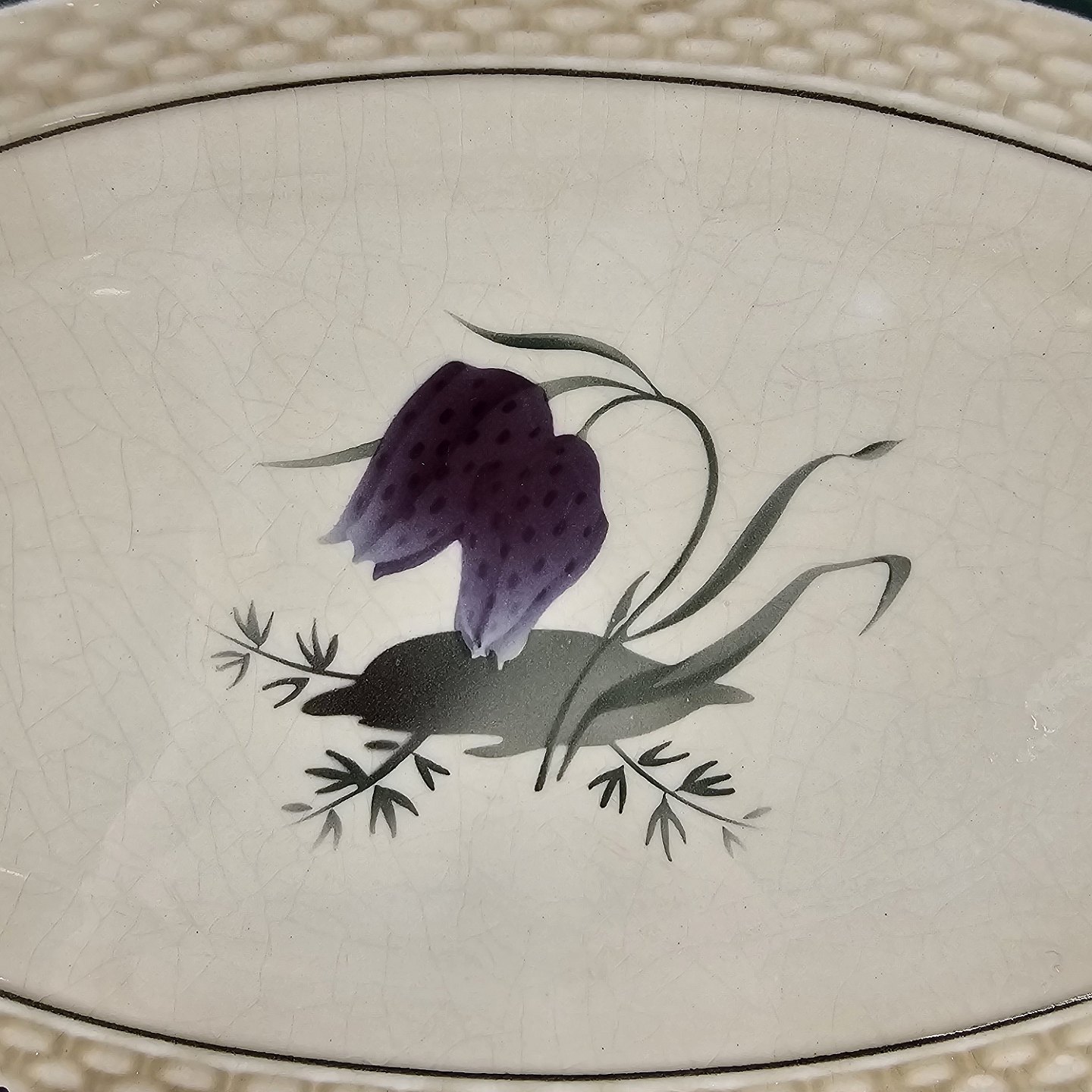 Fajancestel i stelform Viktoria II (Fletværk) med flettet kant og dekoration af en vibeæg blomst i violet og grøn, fremstillet i perioden 1934-1967