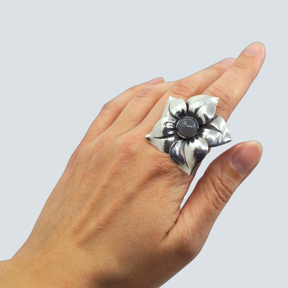 Regitze Overgaard for Georg Jensen; Flower ring in silver, set with a moonstone, no. 562b. Ring size 56.Stamped "Georg Jensen 925 S 562b 56".