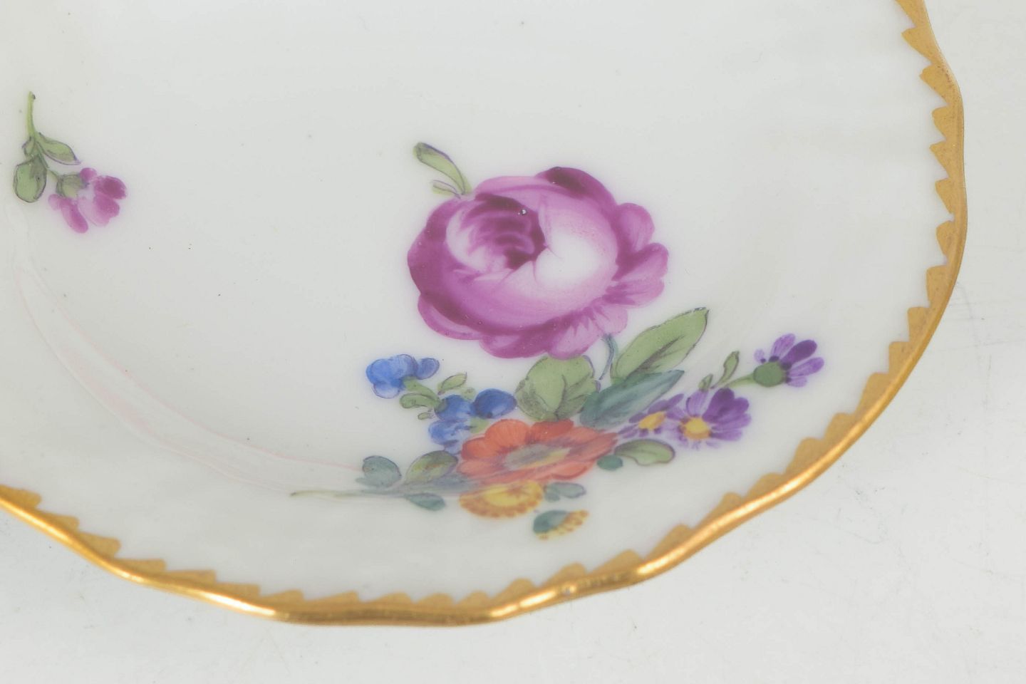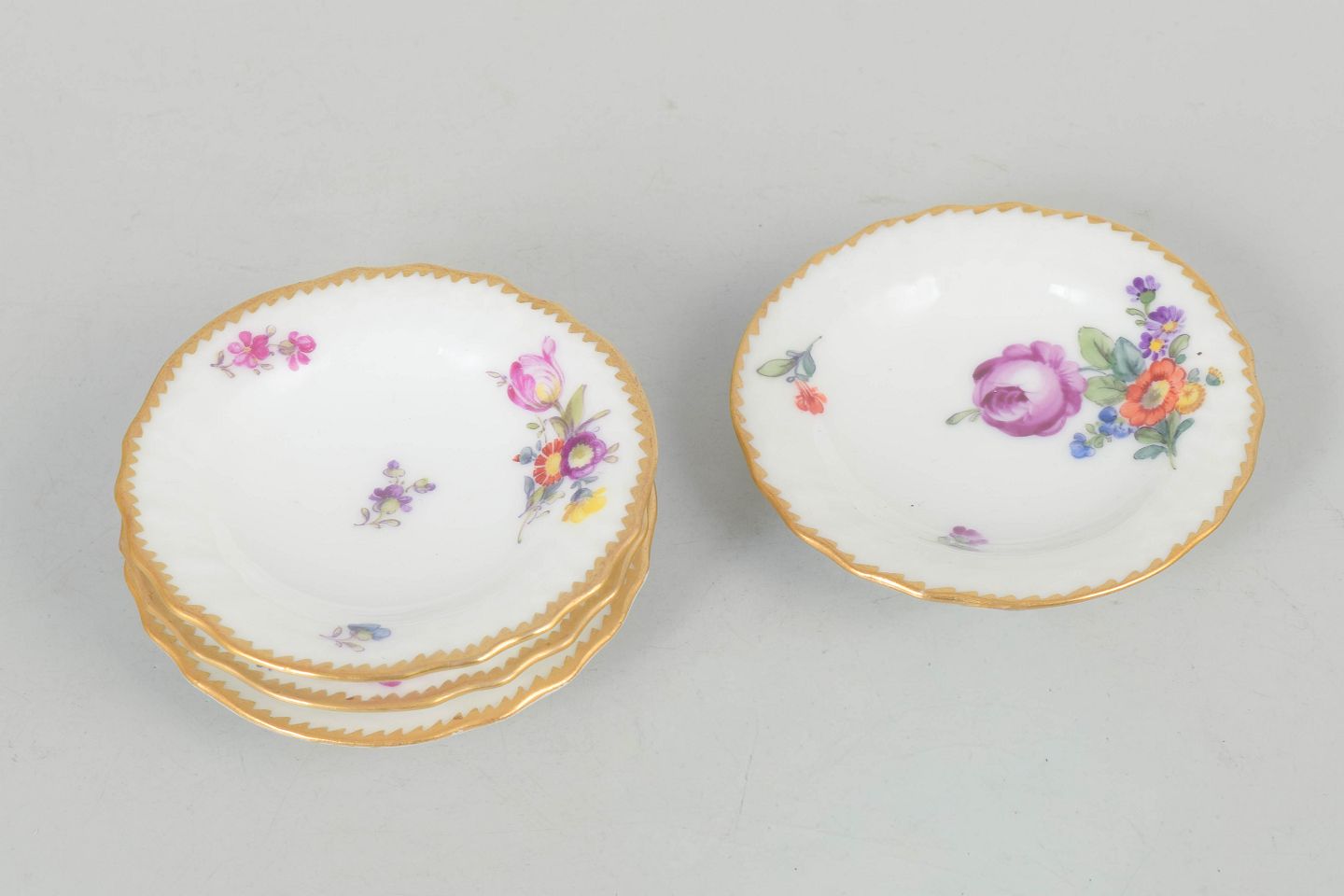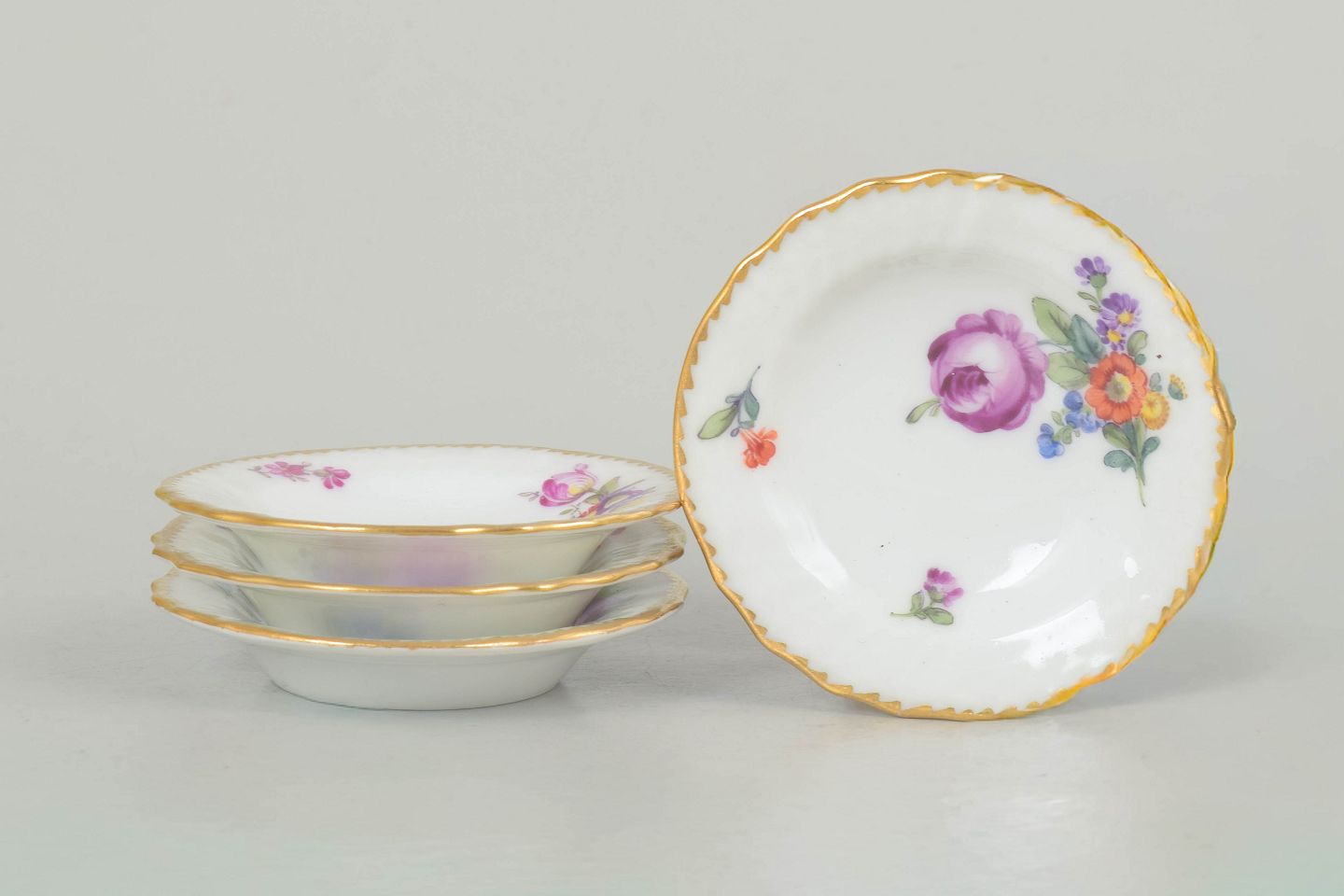 Fine set of four small porcelain caviar dishes decorated with hand-painted floral motifs in the Saxon flower pattern and finished with a gilded rim. Model 4/1505. First factory quality.