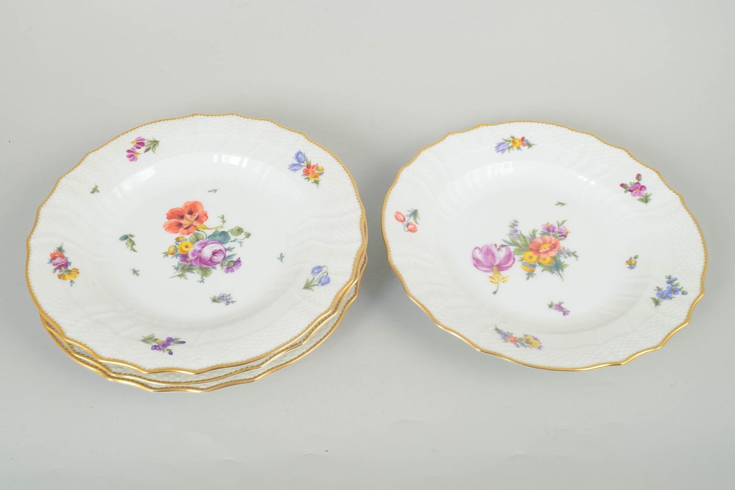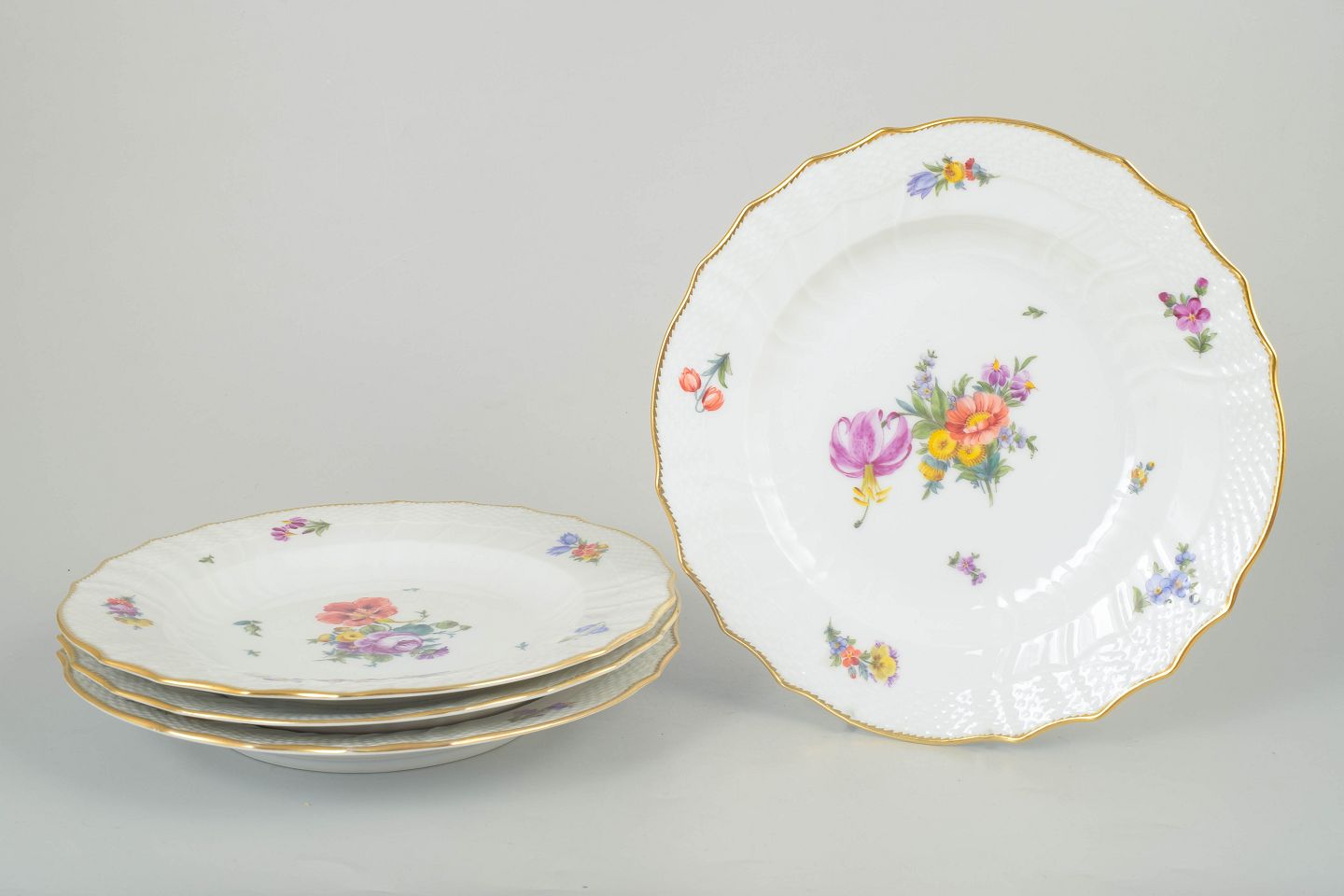 Royal Copenhagen Saxon flower, set of four dinner plates.Elegant set of four porcelain dinner plates decorated with hand-painted floral motifs in the Saxon flower pattern and finished with a gilded rim. Model 4/1621. First factory quality.