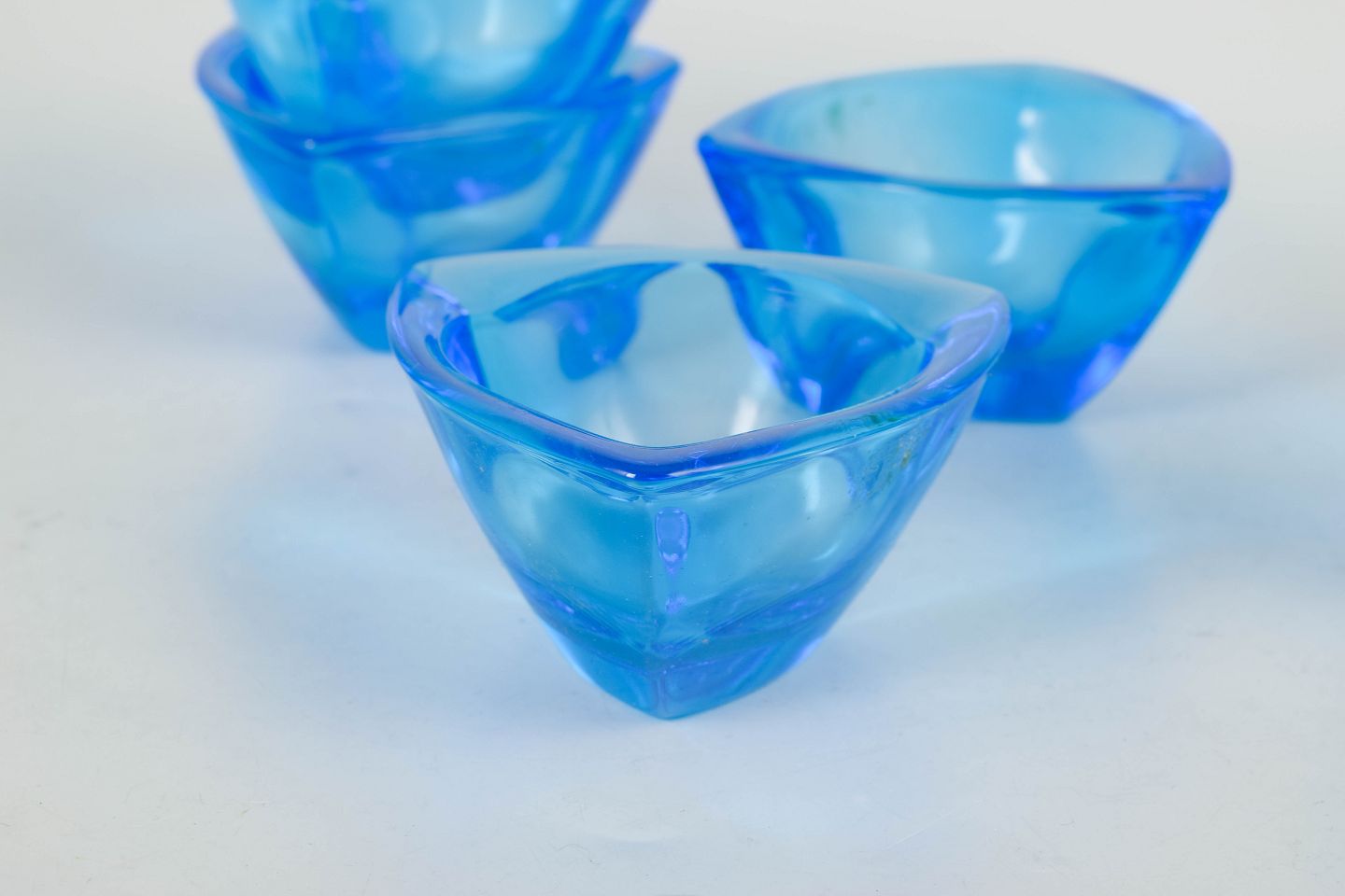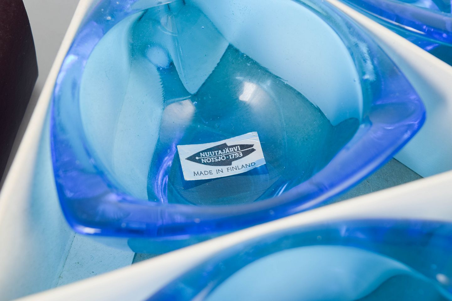 Kaj Franck for Nuutajärvi, set of six bowls.Organically shaped bowls in blue glass, “Bull’s eye” model, with original stickers and box.
