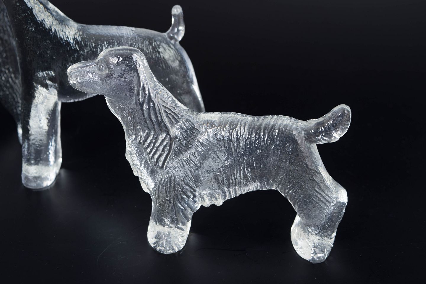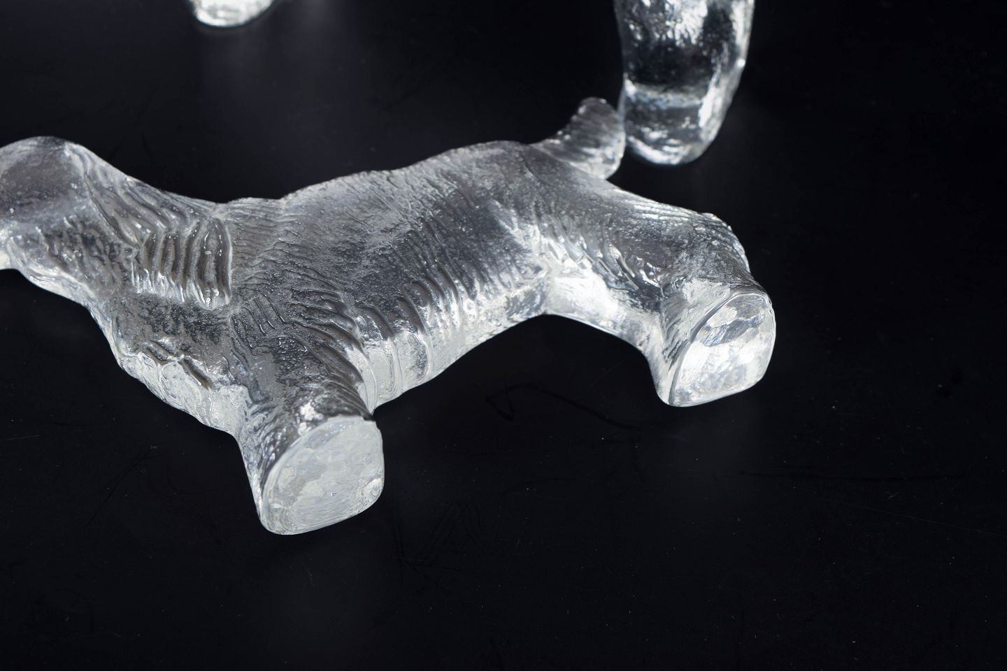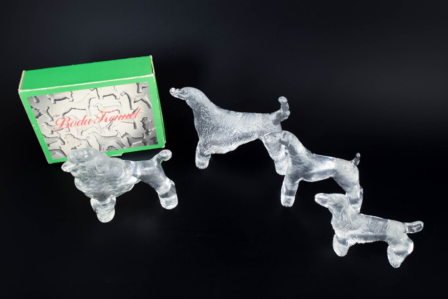 Bertil Vallien for Kosta Boda, set of four dog figures “Kennel”.Set of four sculptural dog figures in clear art glass with textured surface, designed by Bertil Vallien for Kosta Boda. The organic forms and subtle frosting create a lively and expressive appearance. One piece retains the original box.