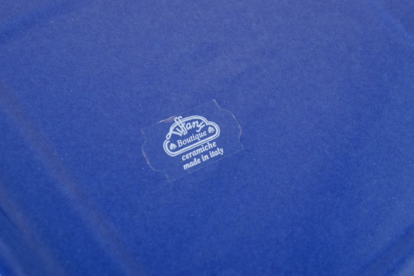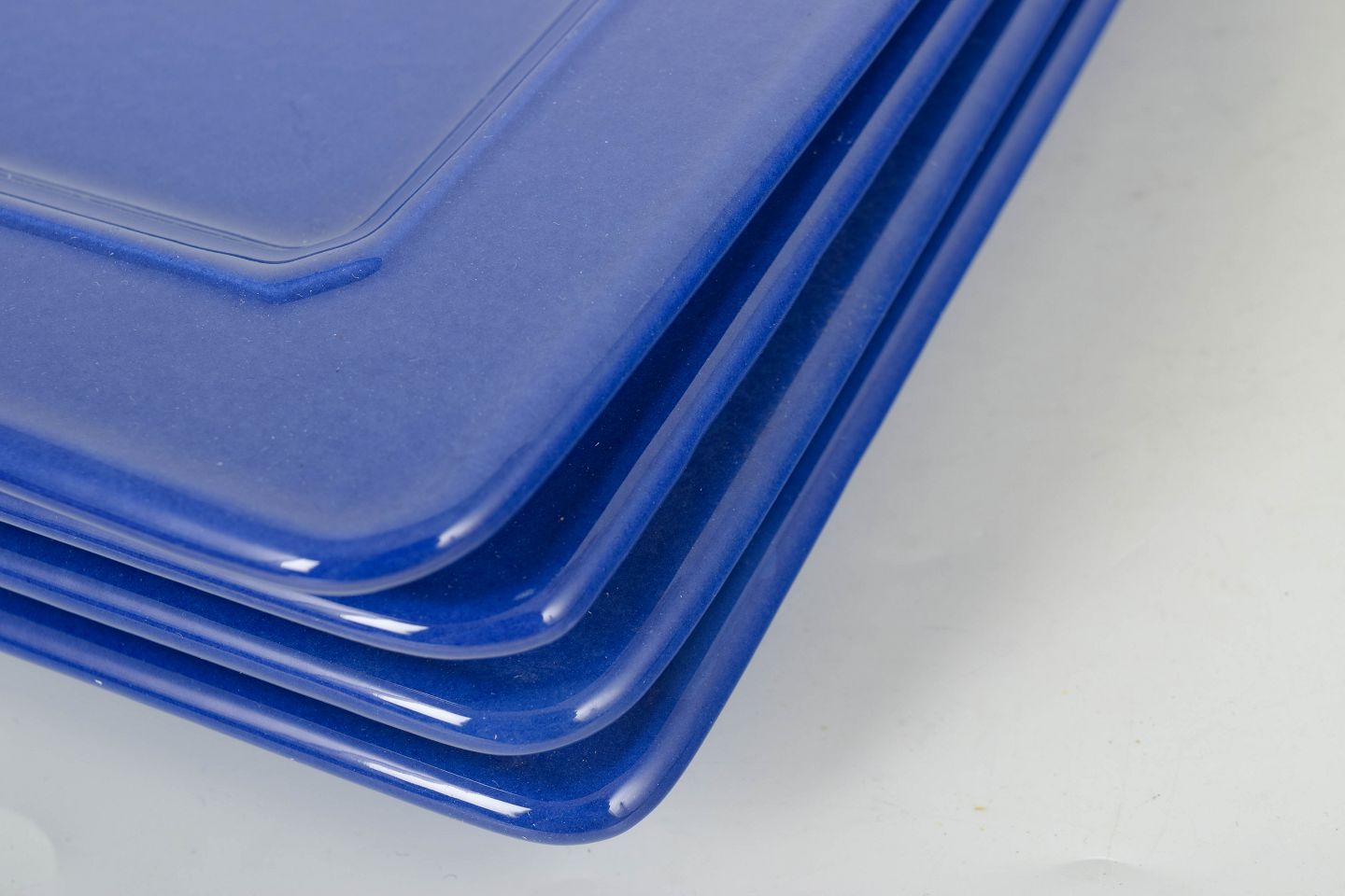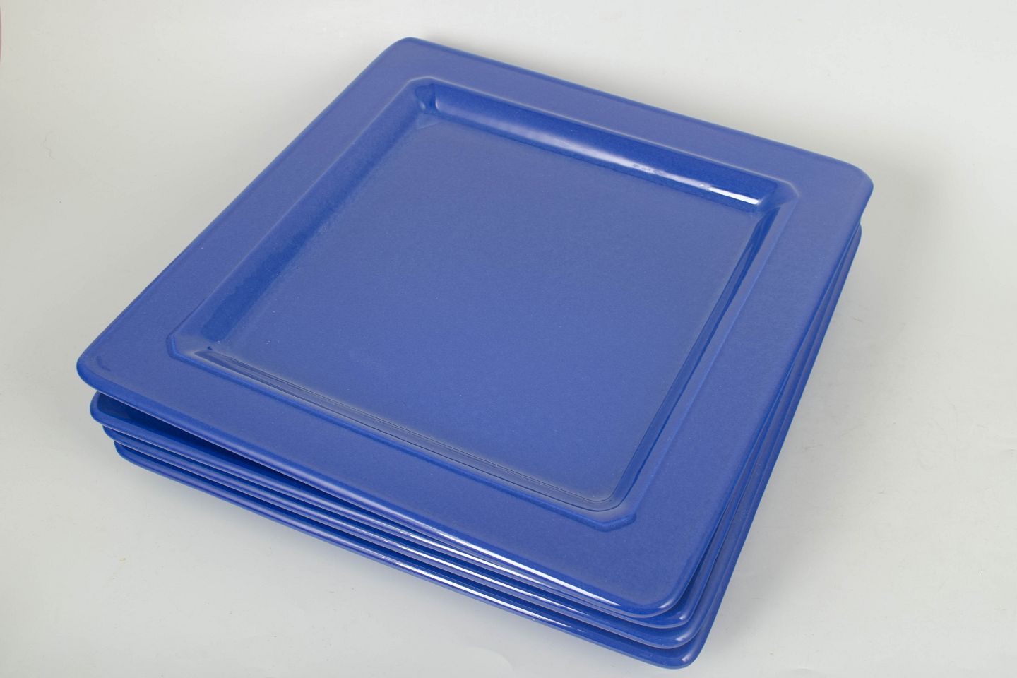 Tiffany Boutique, set of four large plates.Minimalist set of glazed ceramic consisting of four large square plates in a uniform blue colour with a glossy finish.