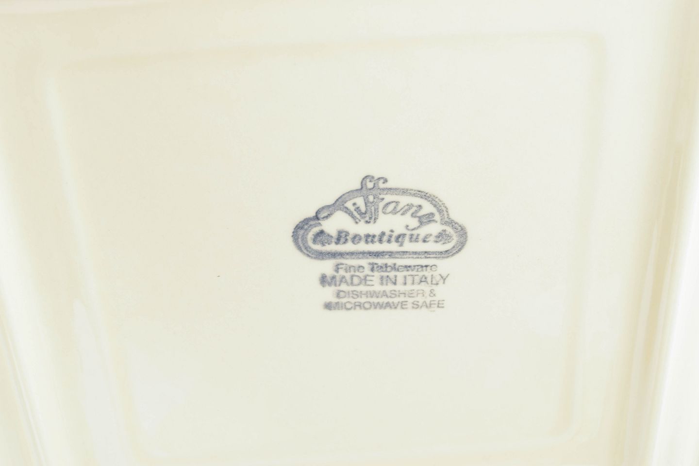 Tiffany Boutique, set of four dinner plates.Decorative ceramic set consisting of four dinner plates with a wide border in blue, yellow and gilt tones with ornamental motifs.