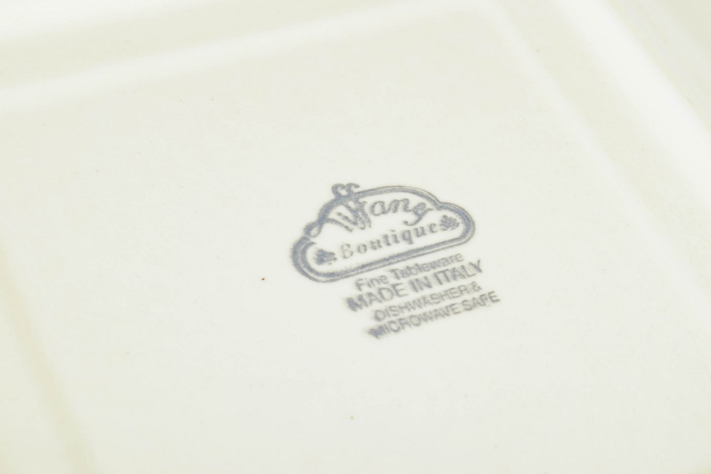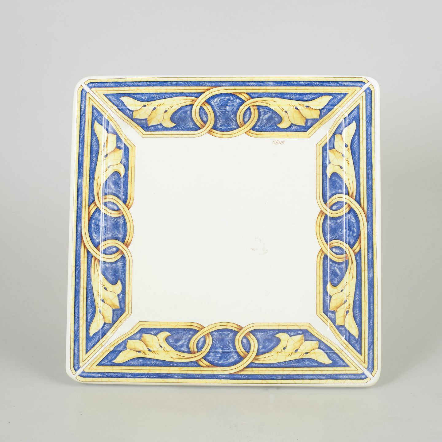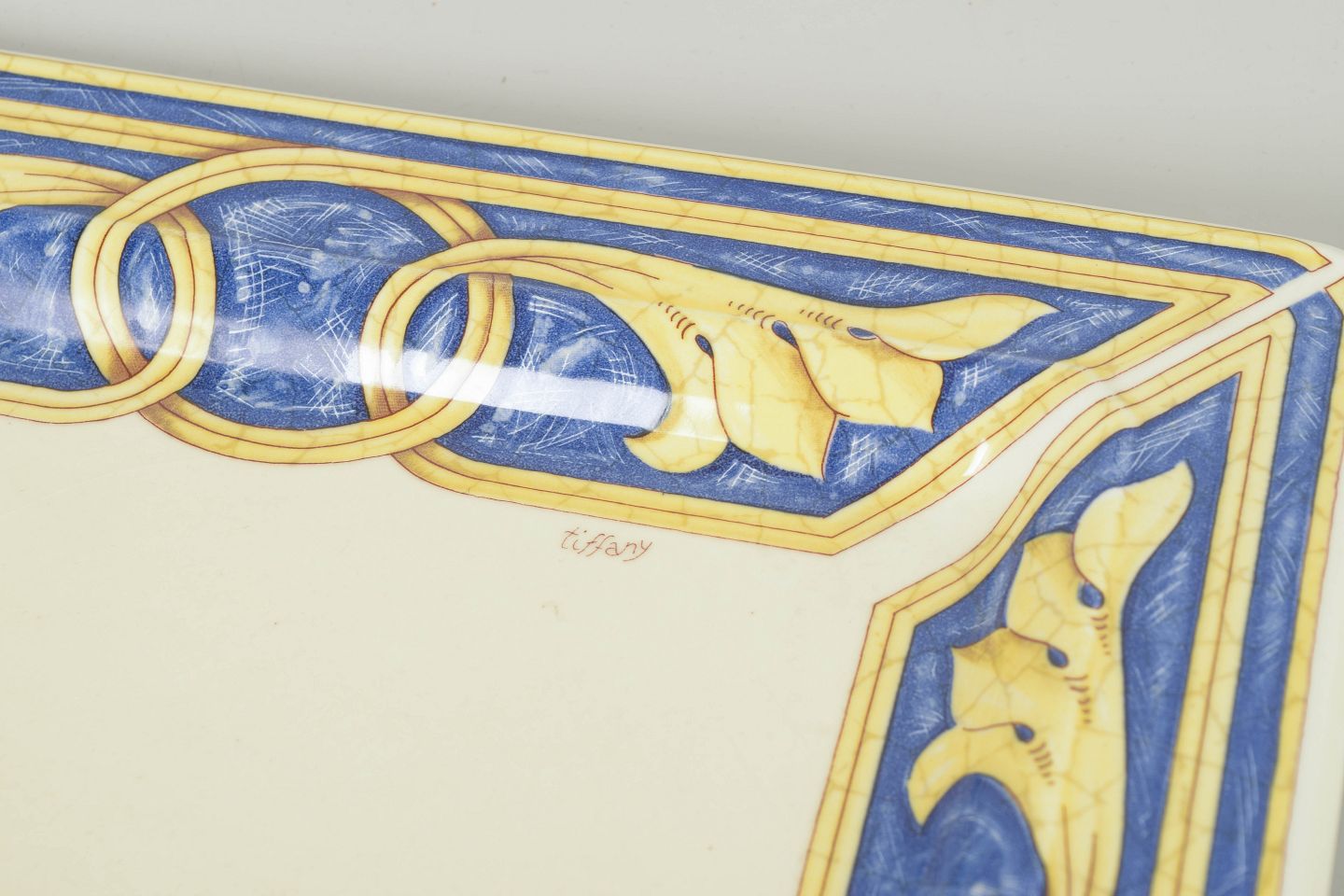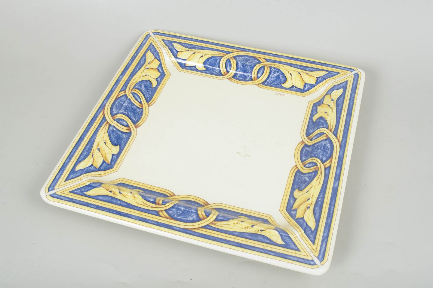 Tiffany Boutique, large square dish.Decorative square ceramic dish with a central white field and a wide border in blue, yellow and gilt tones with ornamental motifs.