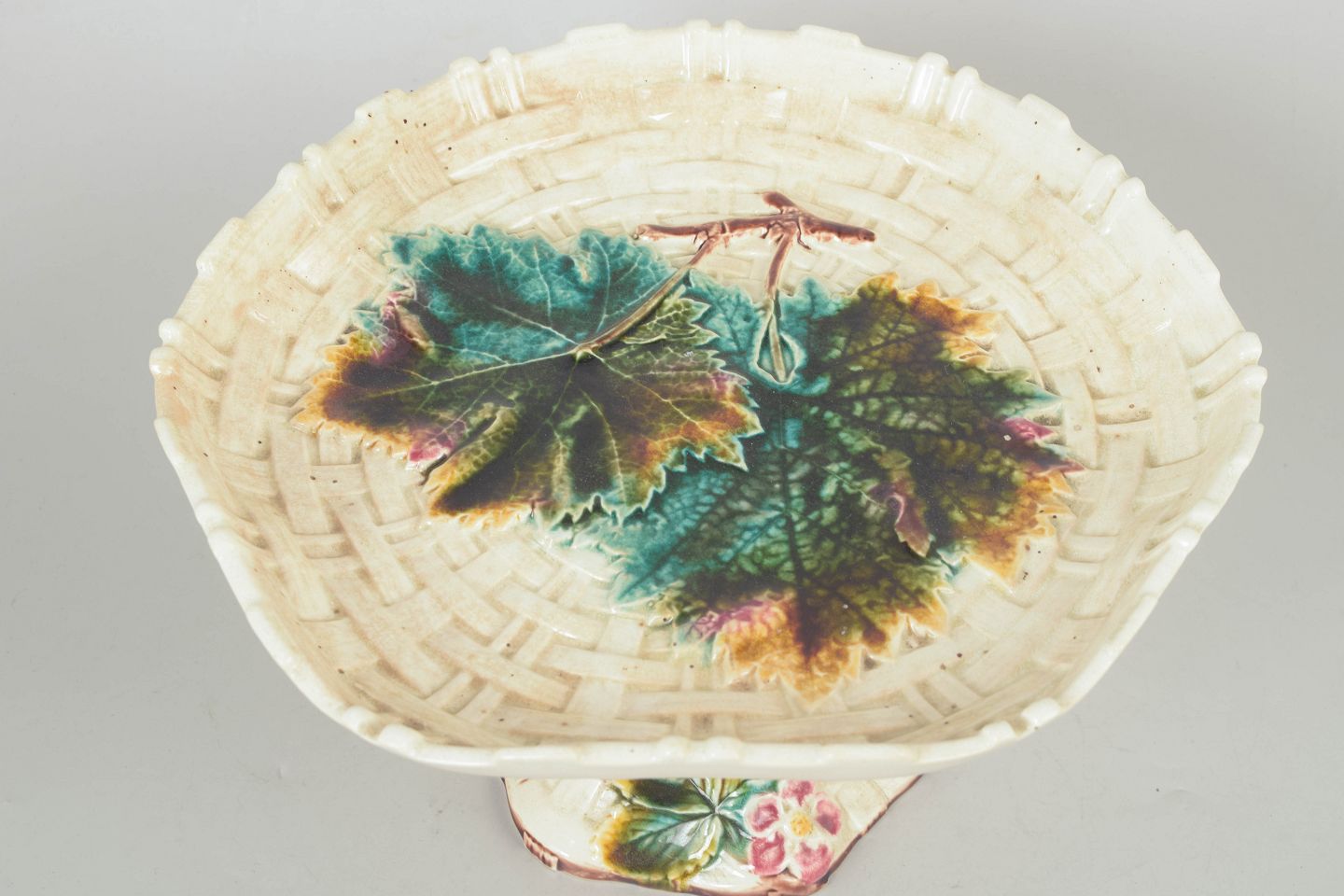 Gustavsberg majolica compote.Decorative compote in glazed ceramic with relief moulded and naturalistic floral decoration and an iridescent glaze to the dish. Executed in majolica with a richly coloured and detailed surface.