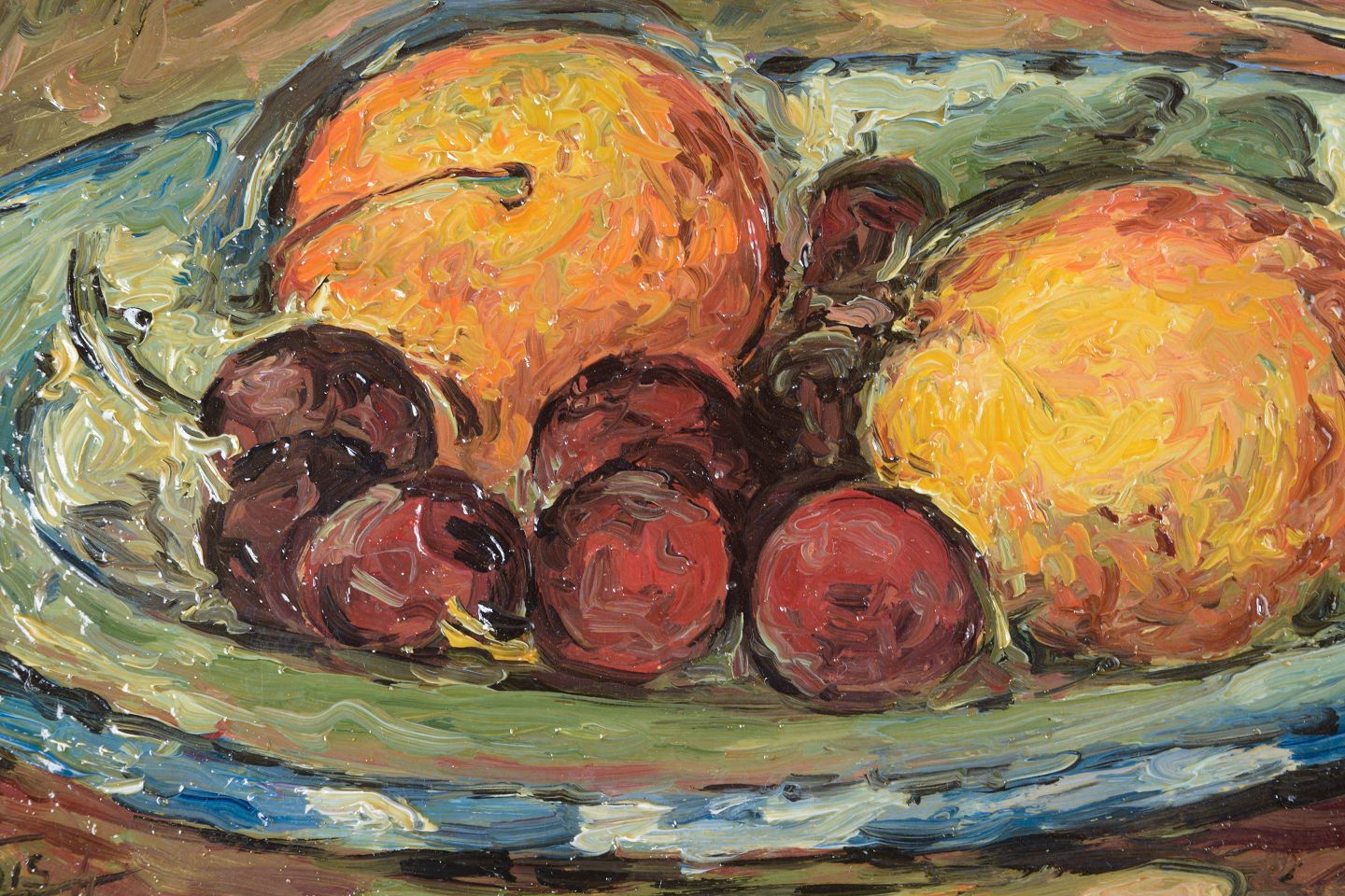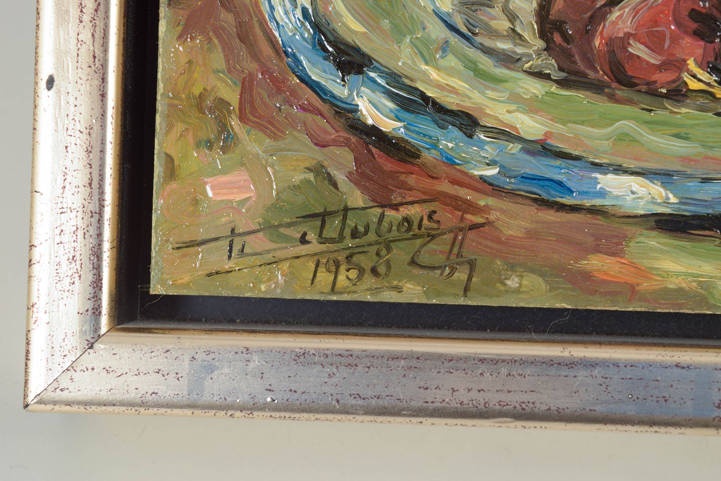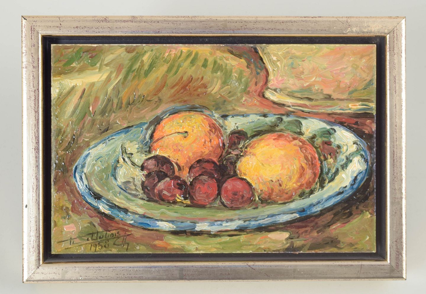 French artist, oil on board, signed illegibly, 1958.Still life with fruit arranged on a dish, executed with vigorous brushwork and warm, saturated colours in an expressive and slightly abstracted manner.
