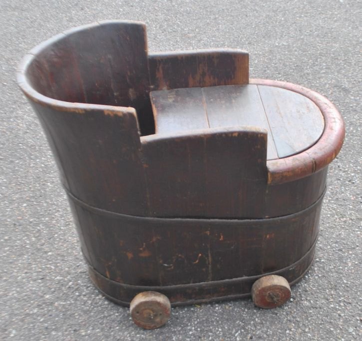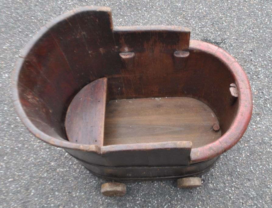 Children's bathtub, 19th century. Glued painted wood. With barrel band. On 4 wheels. H: 51 cm. L: 61 cm. W: 39 cm.Item number: 29186
