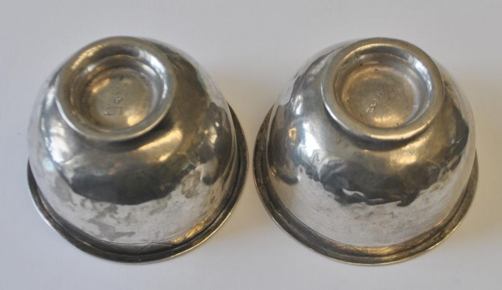 Pair of Swedish silver goblets, Peter Neiindorff, Lidköping (1797 - 1835). On stand edge. With decorations on corpus. Stamped. Height: 4 cm. Dia.: 6 cm.NB: Sold as a pair only!