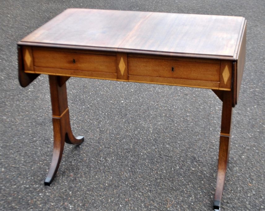 Work table with flaps in mahogany with inlay, approx. 1900. Denmark. Empire style. With drawer. L.: 88 cm. W.: 58 cm. H.: 77 cm. Opened length: 132 cm.Excellent condition.