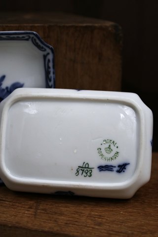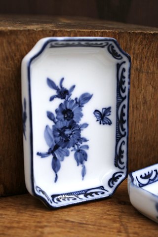 Rare small antique Blue Flower asiet with the classic blue flower motif and small flying insect. Decoration number: 10/8733. from the year 1898-1923. H: 1.8cm. 9.5 x 6.5cm.2nd grade. Has some small glaze dots. (2 pieces in stock)