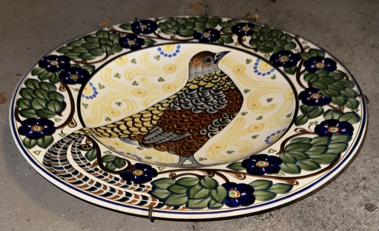 Large earthenware dish from Aluminia, decorated by Christian Joachim with a motif of a golden pheasant surrounded by flowers and leaves. Factory mark on the back. As can be seen from the photos, there are several cracks after damage to the dish. Dimensions: Ø. 45.5 cm PICK-UP AT THE STORAGE ON FREDERIKSBERG.SHIPPING NOT POSSIBLE Dealer