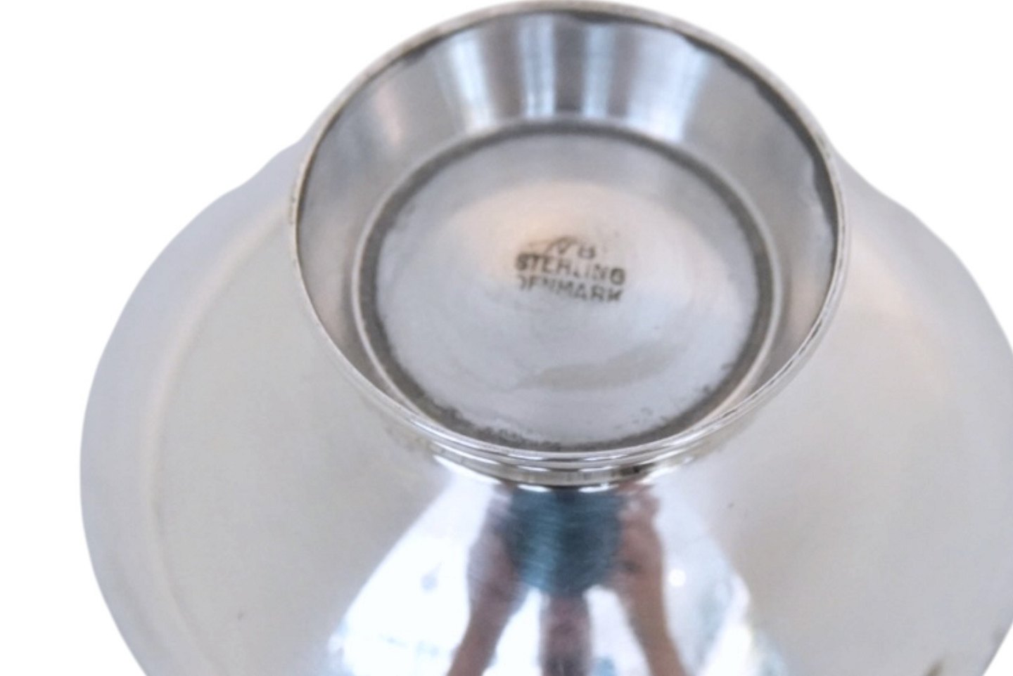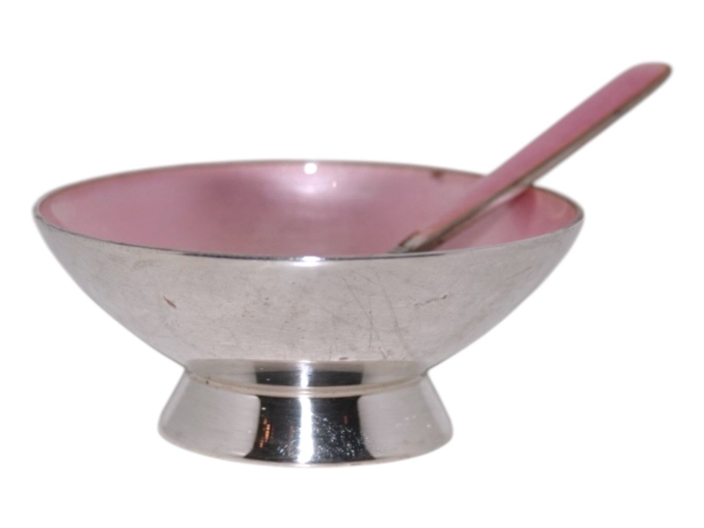 Volmer Bahner & Co sterling silver, small salt jar and salt spoon with pink enamel.Hallmarked "VB STERLING DENMARK". Volmer Bahner & co was a silversmith in Copenhagen from 1962 until 1987.
