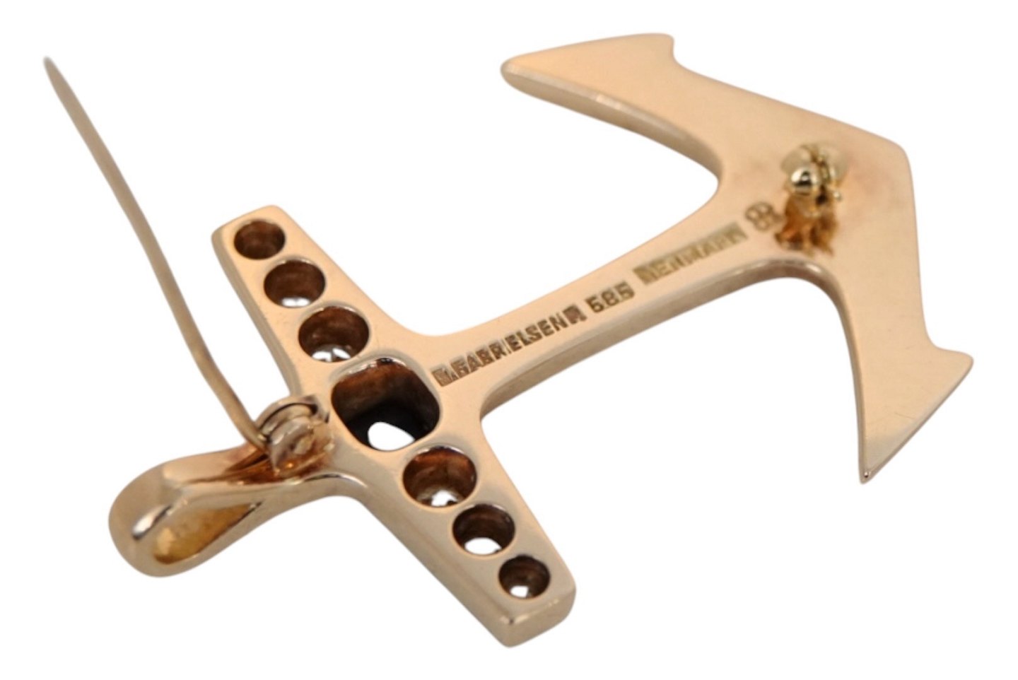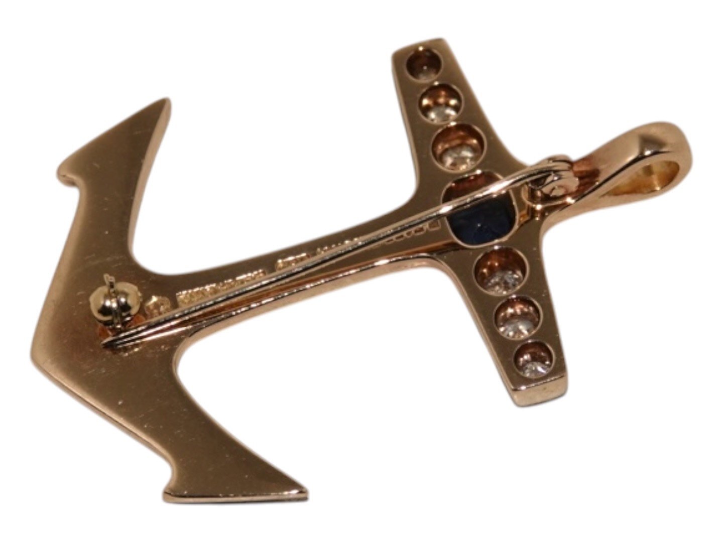 Bent Gabrielsen 14 carat gold large pendant in the shape of an anchor with a rather large blue sapphire and six large diamonds. The jewelry is made in a nice heavy quality. Theis piece can both be used as a brooch and a pendant.PLEASE NOTE THAT THIS JEWELLERY IS LOCATED IN AN EXTERN SAFE BOX AND CAN ONLY BE SEEN ON APPOINTMENT ONE DAY IN ADVANCE.
